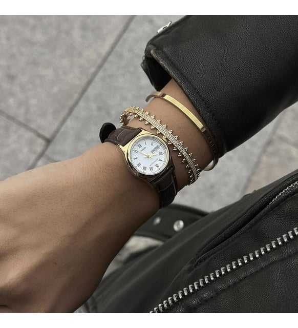 Casio LTP-V006GL-7BUDF para mujer. Reloj clásico con esfera blanca, números romanos y correa de cuero café. Estilo elegante con calendario día/fecha, ideal para un look refinado y atemporal.