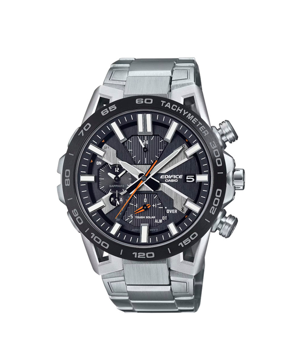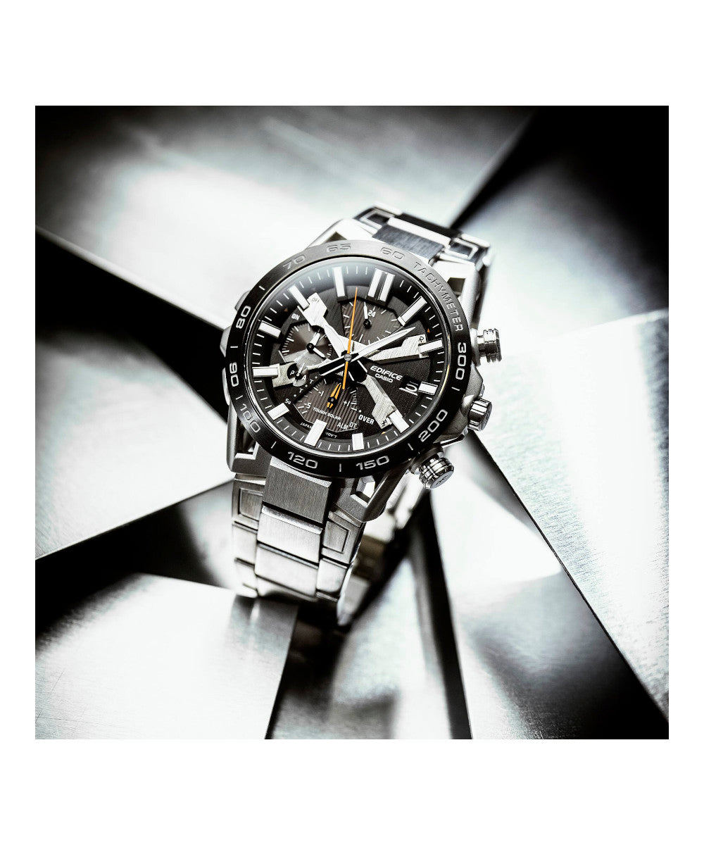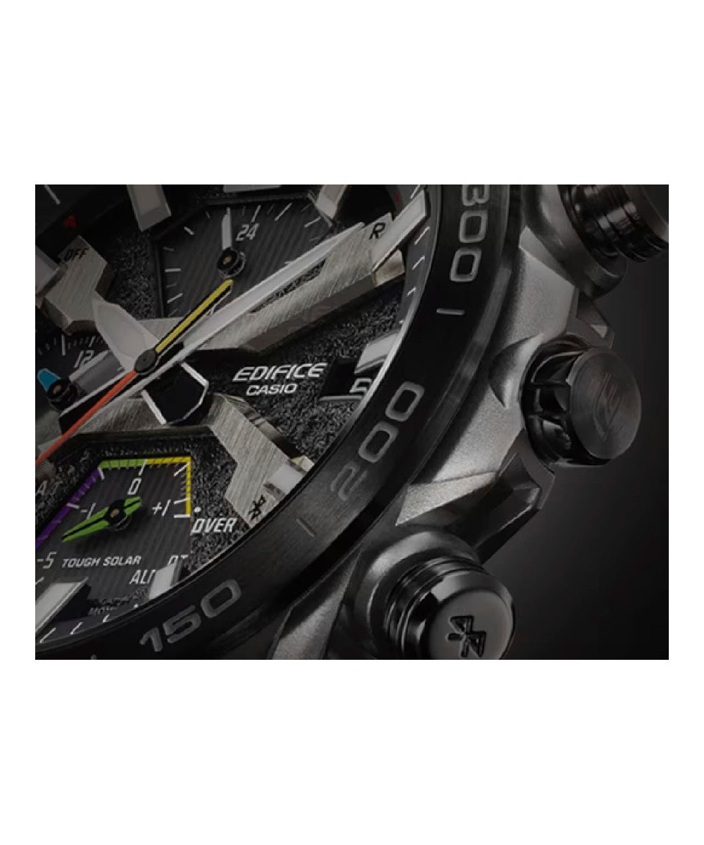 Presentamos la verdadera forma, funcionalidad y sofisticación de los deportes de motor con el cronógrafo insignia de EDIFICE, el SOSPENSIONE EQB-2000. La configuración de lengüeta de cuatro brazos, que aporta innovación y tecnología de alto rendimiento al EDIFICE Speed & Intelligence, se inspira en la suspensión de doble horquilla de cuatro brazos de los autos de carreras. Los componentes clave del dial están codificados por color como el volante para autos de carrera a fin de ofrecer un reconocimiento rápido. El segundero rojo proporciona la visibilidad clara que los equipos de carreras necesitan para hacer que cada segundo cuente. La correa y el marco con baño de iones, junto con el cristal de zafiro, entregan un reloj resistente a los rayones con la apariencia y sensación de un auto de carreras. Es muy fácil de sincronizar con su teléfono inteligente a través de Bluetooth®. Ingrese a la aplicación para acceder a las funciones que son tan importantes para los equipos de carreras: ajuste automático de la indicación de la hora con precisión de segundos, administración sencilla de la hora mundial y transferencia a su teléfono inteligente de los datos del cronómetro medidos en milisegundos para hasta 200 tiempos de vuelta. Tough Solar puede cargar el reloj con la luz solar o incluso la luz de una lámpara fluorescente, lo que almacena energía suficiente para 5 meses de uso normal.