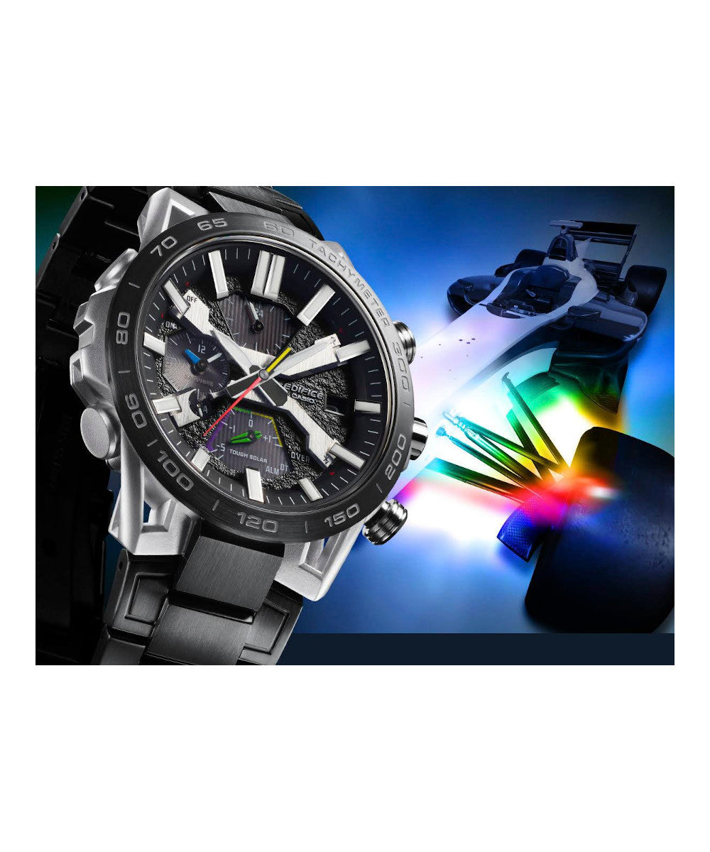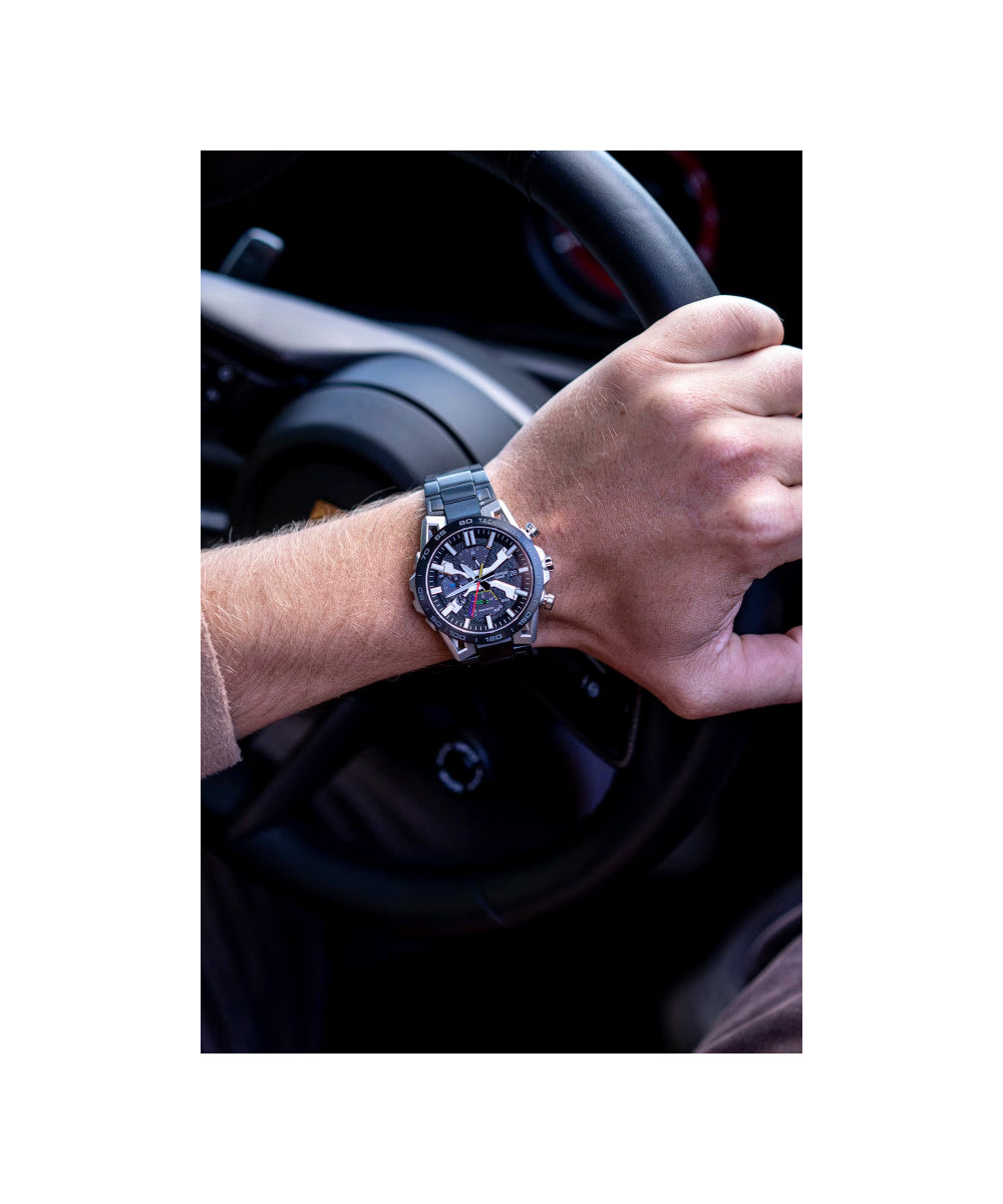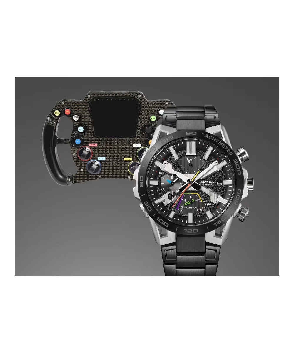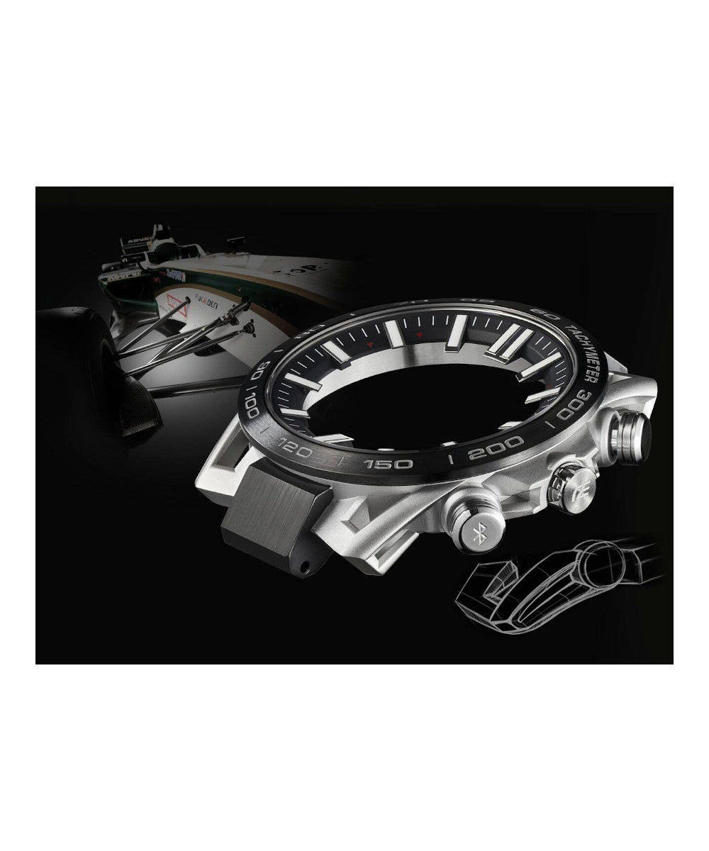 Presentamos la verdadera forma, funcionalidad y sofisticación de los deportes de motor con el cronógrafo insignia de EDIFICE, el SOSPENSIONE EQB-2000. La configuración de lengüeta de cuatro brazos, que aporta innovación y tecnología de alto rendimiento al EDIFICE Speed & Intelligence, se inspira en la suspensión de doble horquilla de cuatro brazos de los autos de carreras. Los componentes clave del dial están codificados por color como el volante para autos de carrera a fin de ofrecer un reconocimiento rápido. El segundero rojo proporciona la visibilidad clara que los equipos de carreras necesitan para hacer que cada segundo cuente. La correa y el marco con baño de iones, junto con el cristal de zafiro, entregan un reloj resistente a los rayones con la apariencia y sensación de un auto de carreras. Es muy fácil de sincronizar con su teléfono inteligente a través de Bluetooth®. Ingrese a la aplicación para acceder a las funciones que son tan importantes para los equipos de carreras: ajuste automático de la indicación de la hora con precisión de segundos, administración sencilla de la hora mundial y transferencia a su teléfono inteligente de los datos del cronómetro medidos en milisegundos para hasta 200 tiempos de vuelta. Tough Solar puede cargar el reloj con la luz solar o incluso la luz de una lámpara fluorescente, lo que almacena energía suficiente para 5 meses de uso normal.
