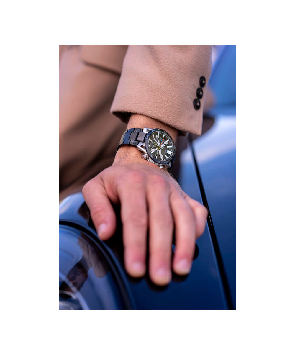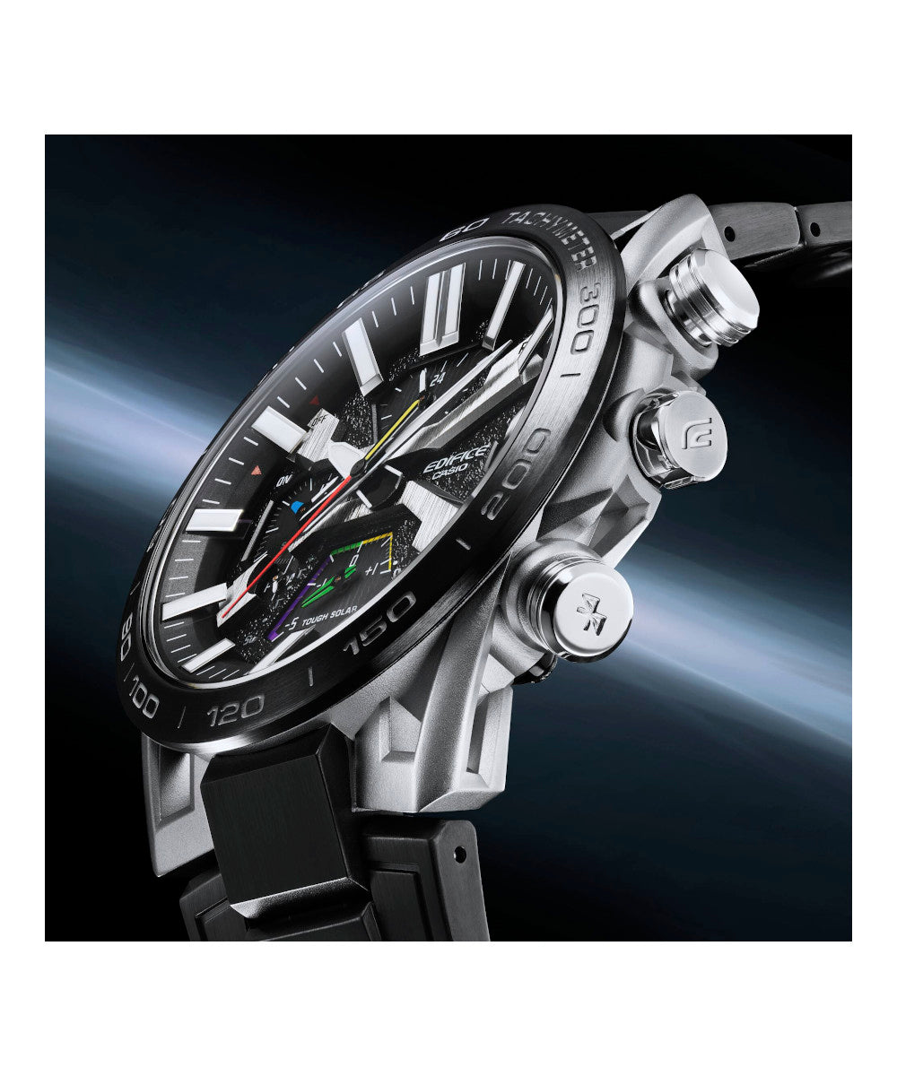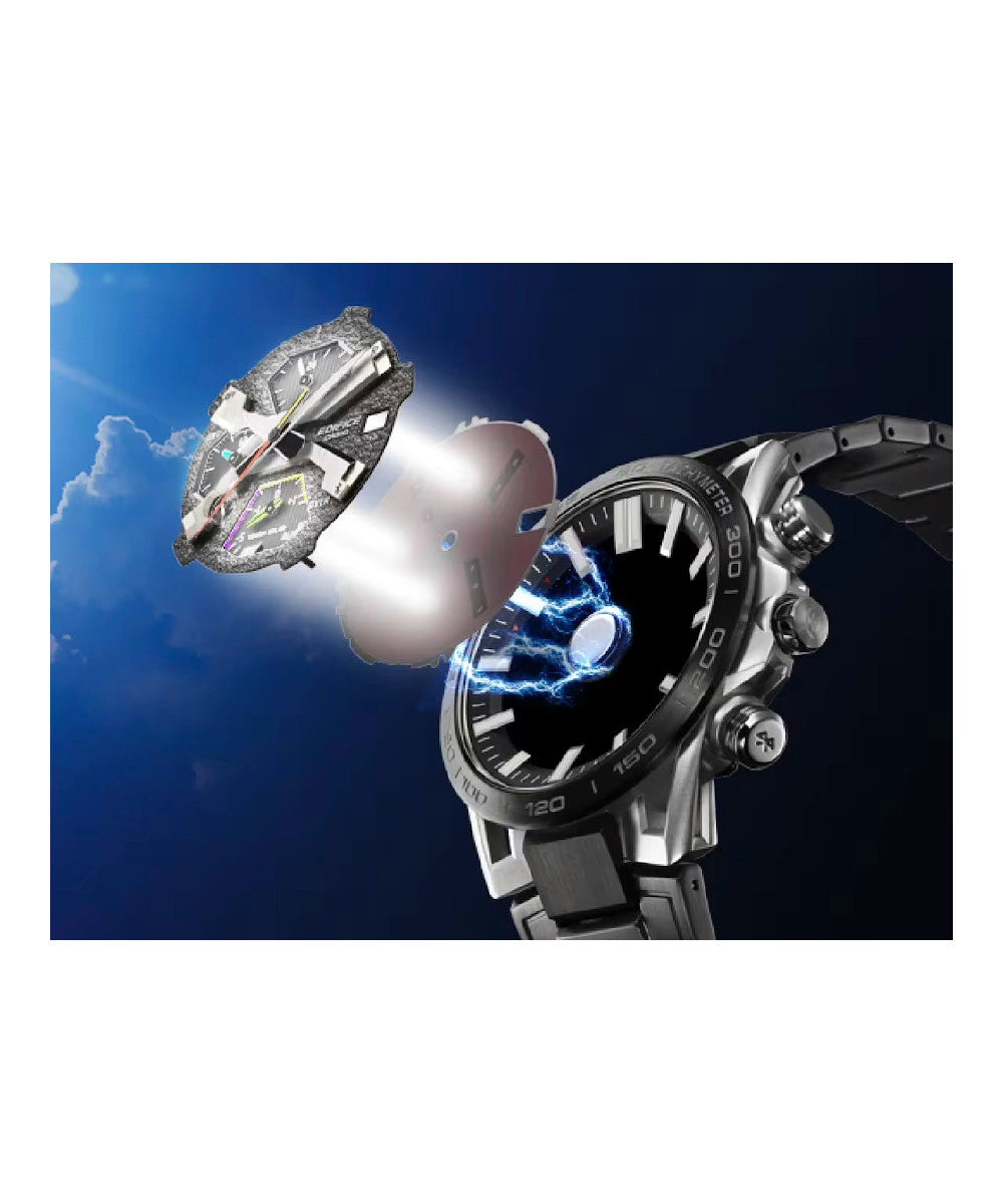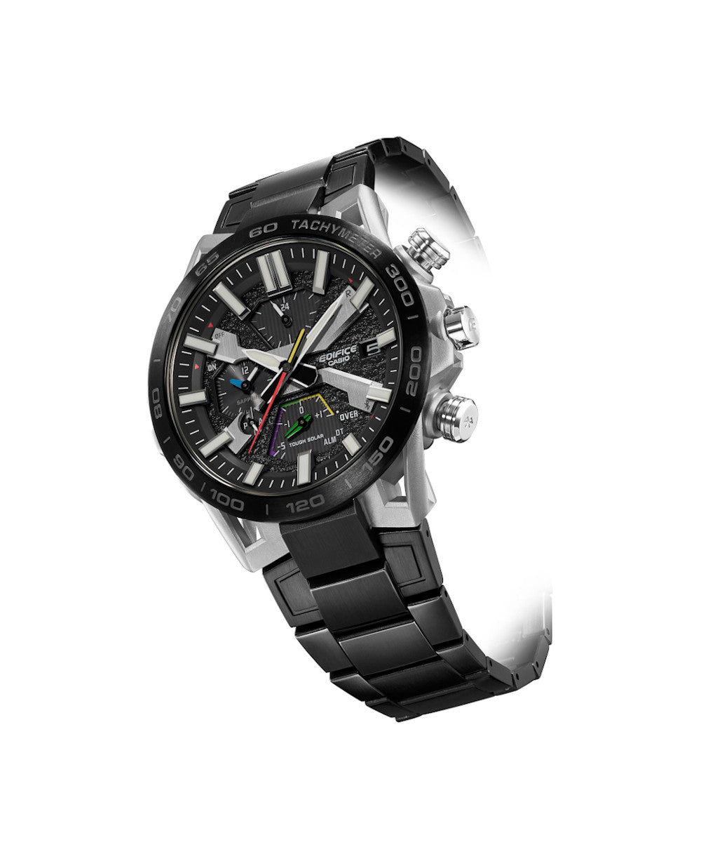 Presentamos la verdadera forma, funcionalidad y sofisticación de los deportes de motor con el cronógrafo insignia de EDIFICE, el SOSPENSIONE EQB-2000. La configuración de lengüeta de cuatro brazos, que aporta innovación y tecnología de alto rendimiento al EDIFICE Speed & Intelligence, se inspira en la suspensión de doble horquilla de cuatro brazos de los autos de carreras. Los componentes clave del dial están codificados por color como el volante para autos de carrera a fin de ofrecer un reconocimiento rápido. El segundero rojo proporciona la visibilidad clara que los equipos de carreras necesitan para hacer que cada segundo cuente. La correa y el marco con baño de iones, junto con el cristal de zafiro, entregan un reloj resistente a los rayones con la apariencia y sensación de un auto de carreras. Es muy fácil de sincronizar con su teléfono inteligente a través de Bluetooth®. Ingrese a la aplicación para acceder a las funciones que son tan importantes para los equipos de carreras: ajuste automático de la indicación de la hora con precisión de segundos, administración sencilla de la hora mundial y transferencia a su teléfono inteligente de los datos del cronómetro medidos en milisegundos para hasta 200 tiempos de vuelta. Tough Solar puede cargar el reloj con la luz solar o incluso la luz de una lámpara fluorescente, lo que almacena energía suficiente para 5 meses de uso normal.