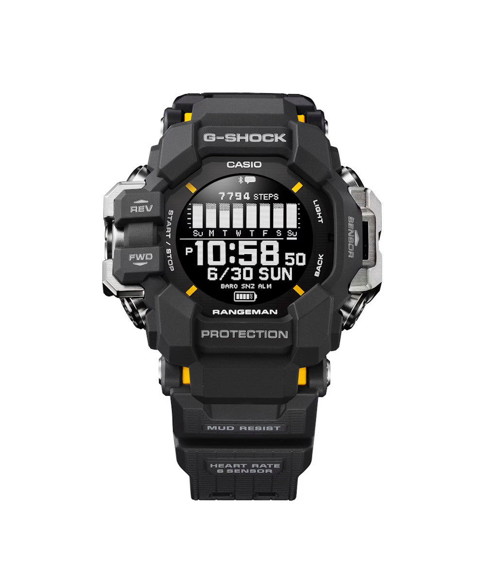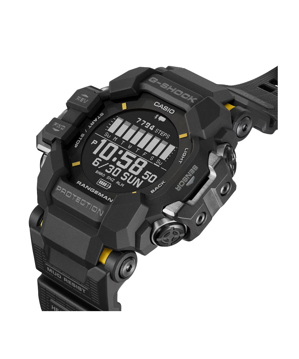 Conquiste terrenos difíciles y llame la atención con un reloj resistente que ofrece una combinación llamativa y atrevida de colores. Diseñados para trabajar incluso en los entornos más difíciles, los relojes especiales MASTER of G llevan la indicación de la hora a otro nivel gracias a un diseño resistente con detalles en amarillo brillante, el cual se utiliza para rescates de emergencia. El GW-9400 RANGEMAN está equipado con Triple Sensor para proporcionar lecturas de altitud, dirección, temperatura y presión barométrica directamente en su muñeca. La estructura cilíndrica de protección de botones garantiza un funcionamiento fluido y preciso del botón del sensor. Presione el botón del sensor y se mostrará al instante el modo de sensor utilizado más recientemente. Tres tipos diferentes de tonos indican diferentes modos de medición, útiles para un funcionamiento sin necesidad de mirar, lo que le permite enfocarse en una aventura más extrema.