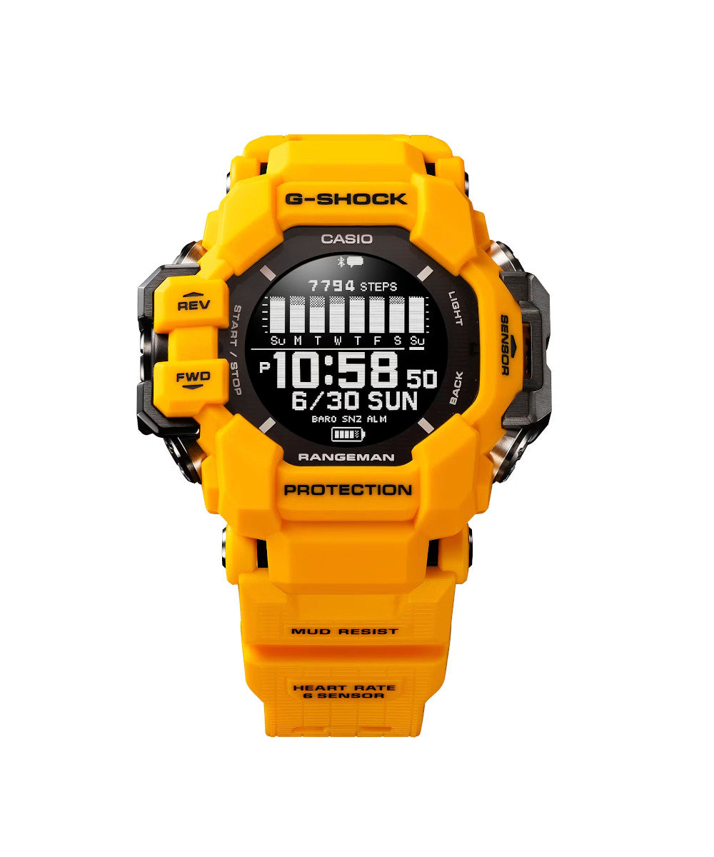 Conquiste terrenos difíciles y llame la atención con un reloj resistente que ofrece una combinación llamativa y atrevida de colores. Diseñados para trabajar incluso en los entornos más difíciles, los relojes especiales MASTER of G llevan la indicación de la hora a otro nivel gracias a un diseño resistente con detalles en amarillo brillante, el cual se utiliza para rescates de emergencia. El GW-9400 RANGEMAN está equipado con Triple Sensor para proporcionar lecturas de altitud, dirección, temperatura y presión barométrica directamente en su muñeca. La estructura cilíndrica de protección de botones garantiza un funcionamiento fluido y preciso del botón del sensor. Presione el botón del sensor y se mostrará al instante el modo de sensor utilizado más recientemente. Tres tipos diferentes de tonos indican diferentes modos de medición, útiles para un funcionamiento sin necesidad de mirar, lo que le permite enfocarse en una aventura más extrema.