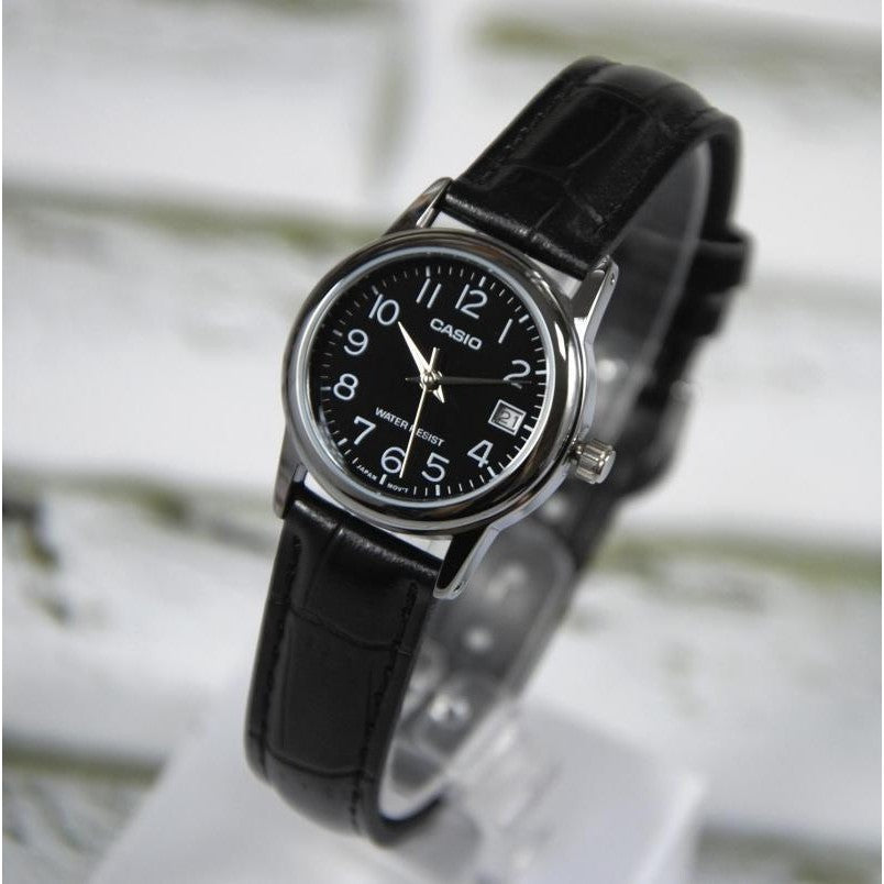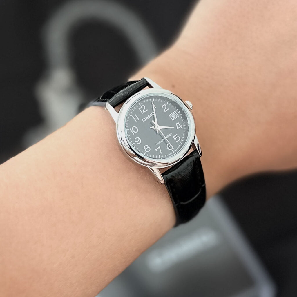 El Casio LTP‑V002L-1BUDF es un reloj analógico femenino con diseño clásico y compacto. Su caja de acero plateado combinada con correa de cuero negro brinda elegancia discreta, ideal para uso diario y para un estilo sobrio.