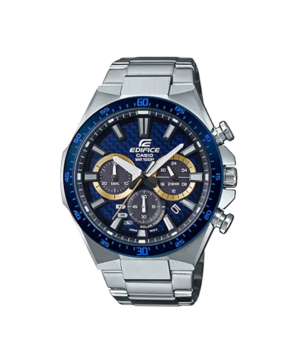 FUNCIONES: Reloj EDIFICE, 100 metros de resistencia al agua, cronógrafo, energía solar, indicador de fecha, caja y pulso en acero inoxidable, selector de fibra de carbono.BATERÍA: Carga solar