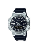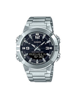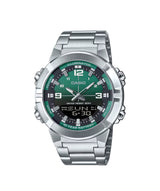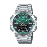 El Casio AMW-870DA-3AVDF combina un diseño elegante en acero con esfera verde y funciones analógico-digitales. Resistente al agua 100 m, con hora mundial, alarmas y batería de 10 años, es ideal para un estilo versátil.