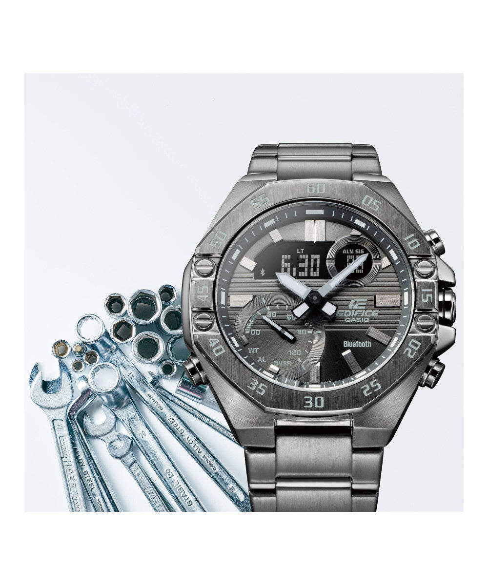 Vinculación con smartphone | Un modelo de vinculación con smartphone que presenta un marco octogonal de EDIFICE, que sigue evolucionando como cronógrafo metálico avanzado de alto rendimiento. Siempre que el reloj esté cerca de un smartphone, puede vincularse a la aplicación exclusiva “EDIFICE Connected” a través de la vinculación con smartphone por Bluetooth® y conectarse sin utilizar botones para corregir la hora. El temporizador de agenda, que se desarrolló en función de los comentarios del equipo de F1, utiliza el reloj para notificar a los usuarios cuando comienzan y terminan los eventos programados en el smartphone. El reloj está equipado con una luz LED que se enciende con una simple inclinación de la muñeca. La carcasa y la correa tienen un acabado con baño de iones de color negro que resiste los rayones.