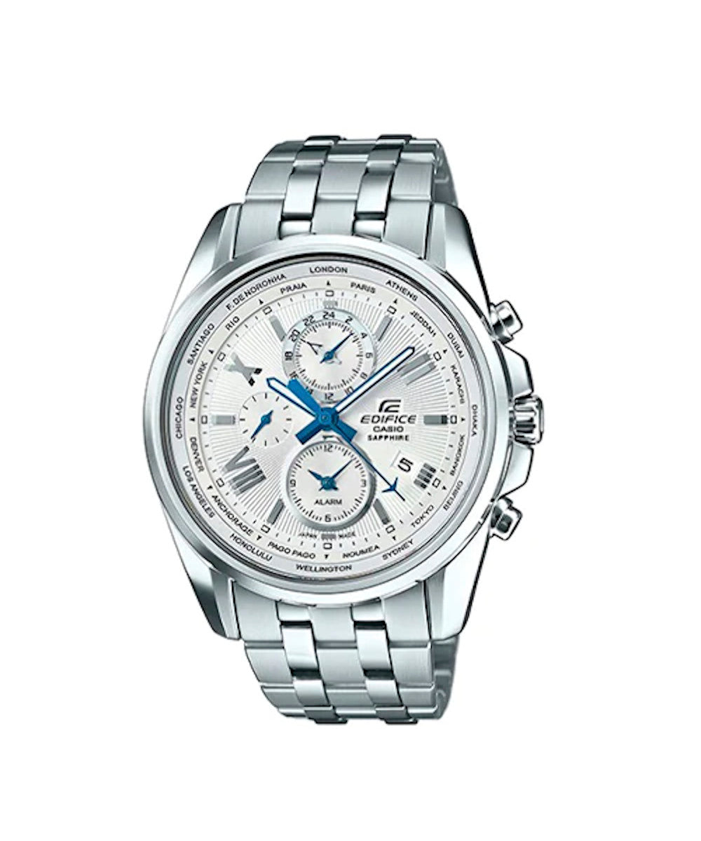 FUNCIONES: Reloj EDIFICE, en acero inoxidable sólido, cristal zafiro, alarma, visualización de la fecha, hora mundial, resistente al agua 100 metros, cronógrafo.