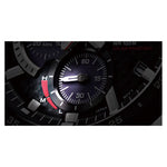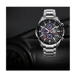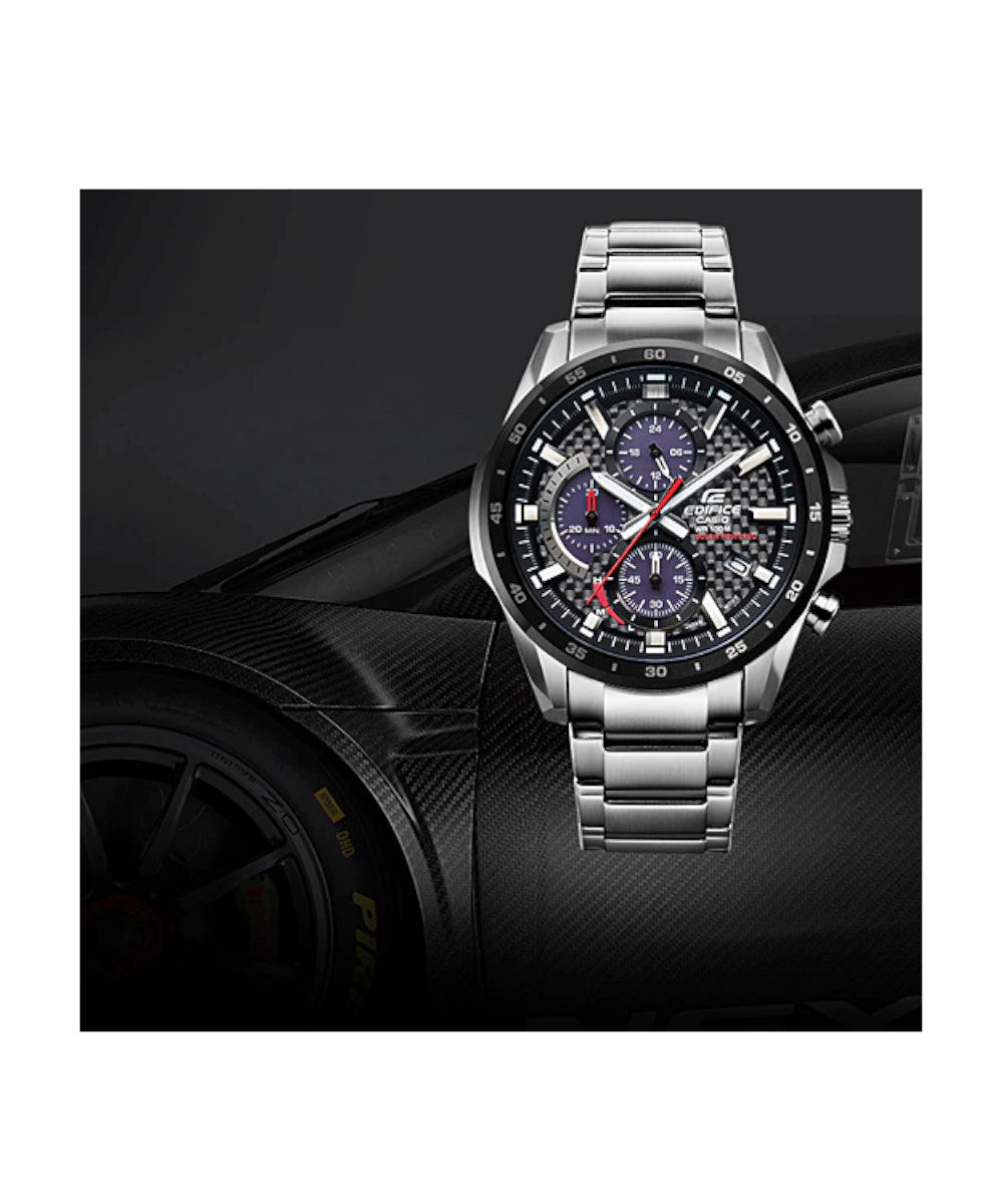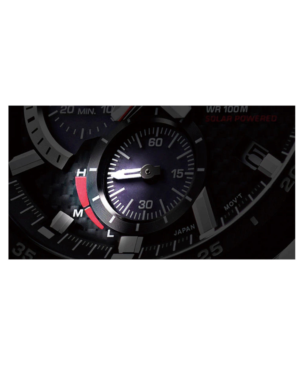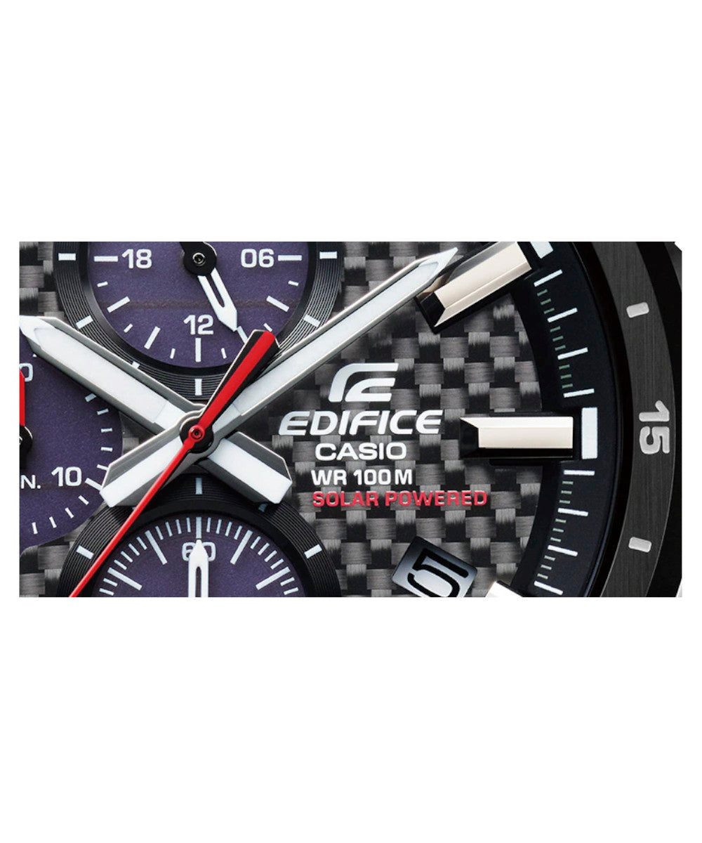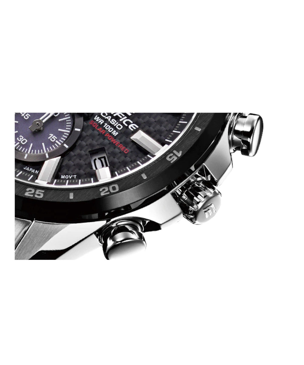 FUNCIONES: Reloj EDIFICE, 100 metros de resistencia al agua, cronógrafo, energía solar, indicador de fecha, caja y pulso en acero inoxidable, selector de fibra de carbono.
