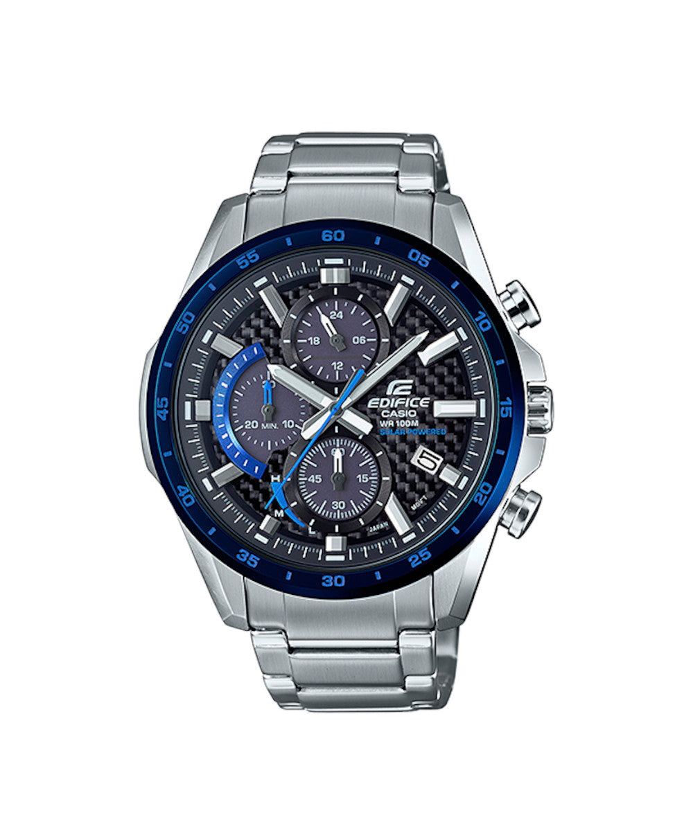 FUNCIONES: Reloj EDIFICE, 100 metros de resistencia al agua, cronógrafo, energía solar, indicador de fecha, caja y pulso en acero inoxidable, selector de fibra de carbono.