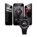 FUNCIONES: Vinculación con teléfono inteligente, Hora mundial de aproximadamente 300 ciudades, Alarma, Temporizador, Corrección del ajuste de la manecilla, Cambio de hora, Mobile Link (conectividad inalámbrica con Bluetooth®), buscador de teléfono, Tough Solar, Super Illuminator (doble) con luz completamente automática ilumina la esfera y la pantalla digital, Estructura Carbon Core Guard.