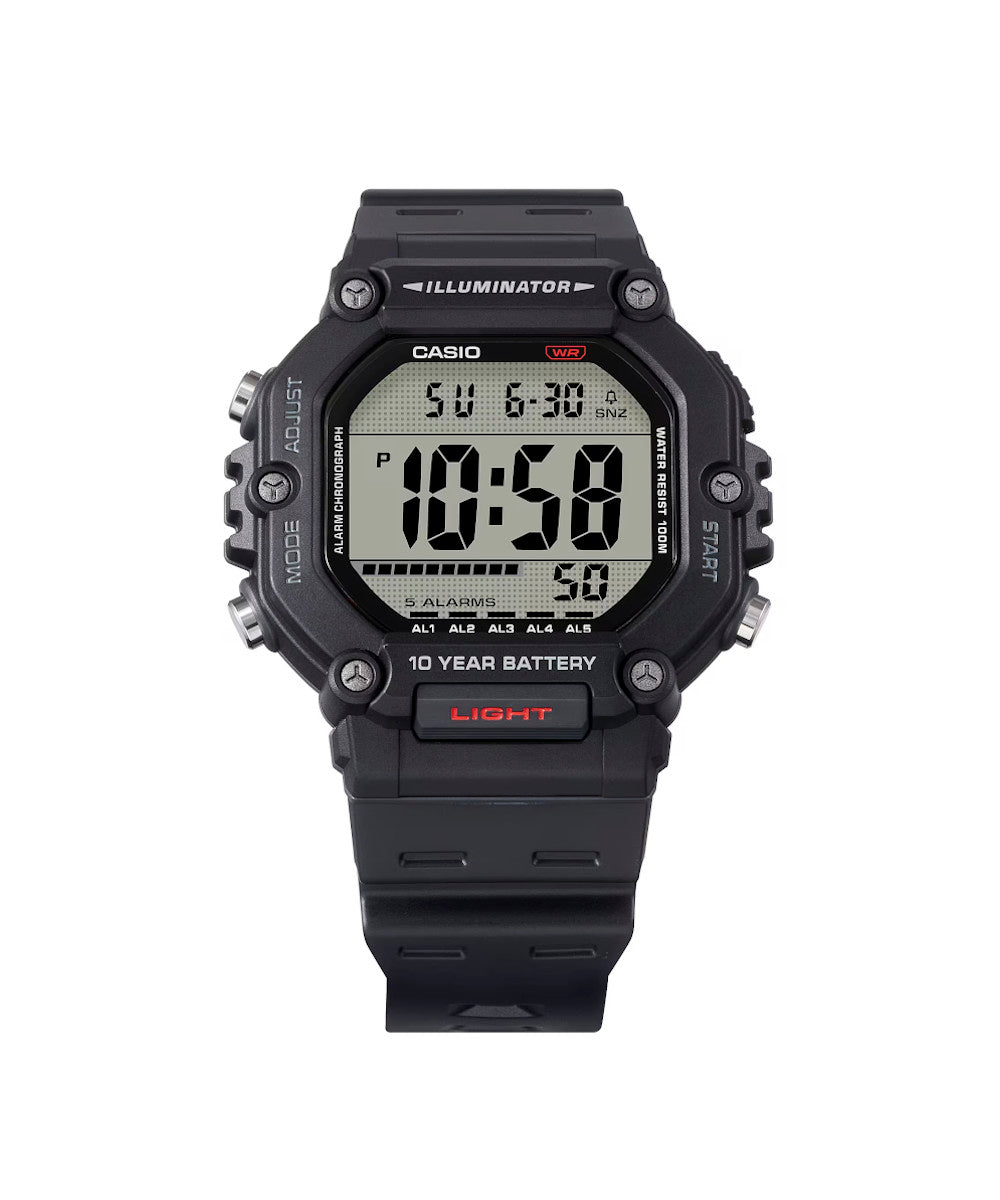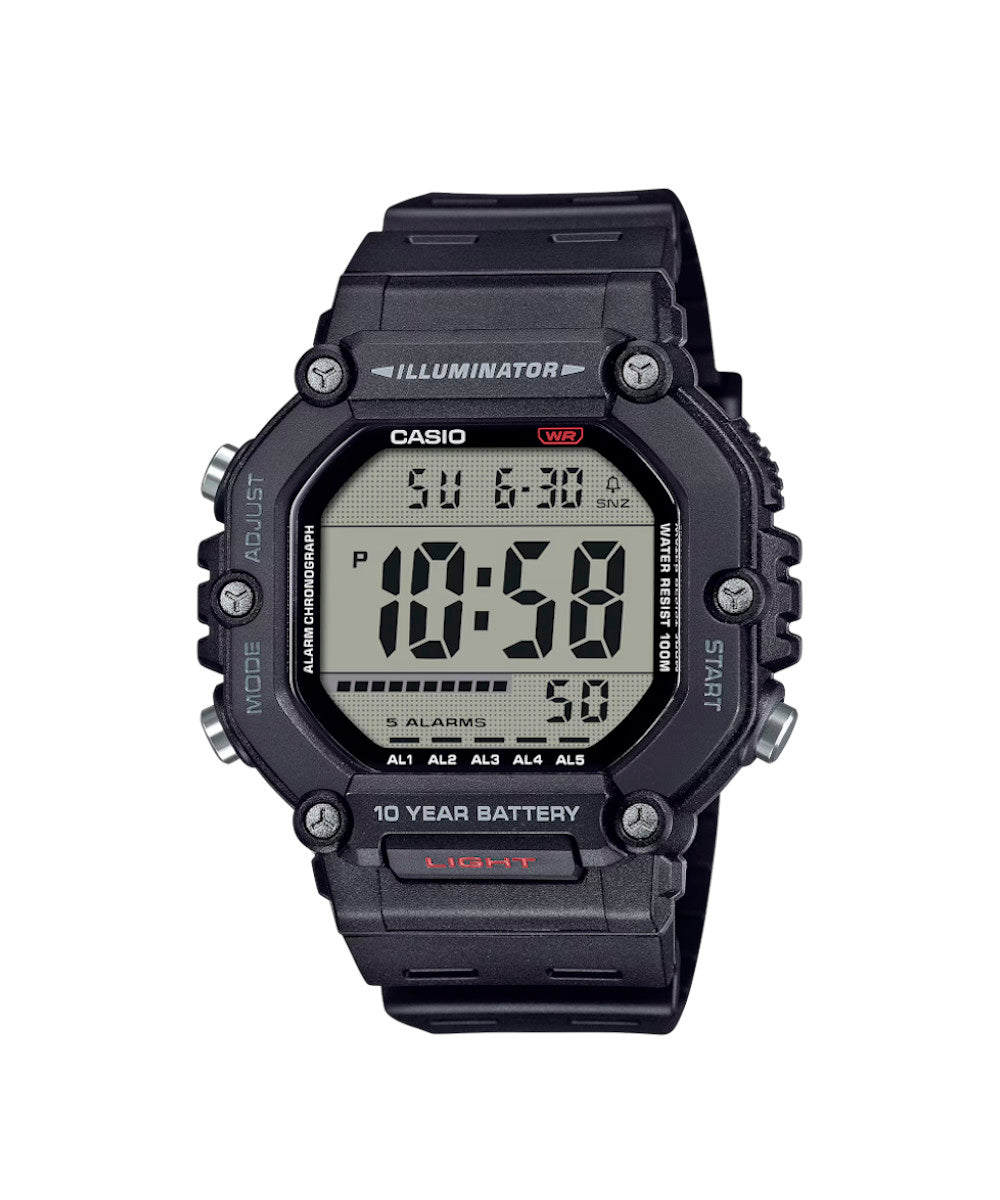 El Casio AE-1600H-1AVDF en color negro ofrece resistencia y practicidad. Con batería de 10 años, resistencia al agua 100 m y funciones como hora mundial, cronómetro y alarmas, es perfecto para un estilo deportivo y duradero.