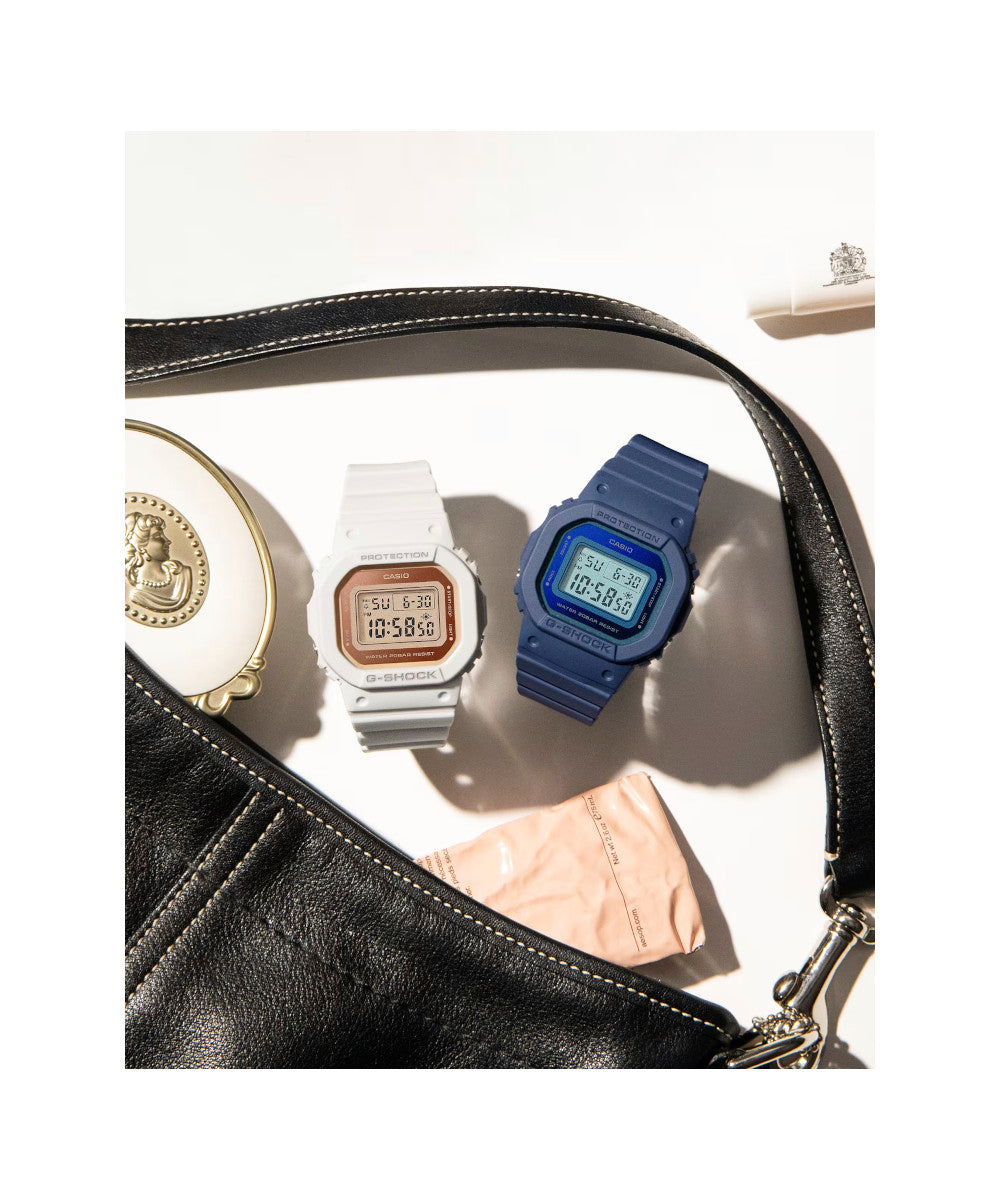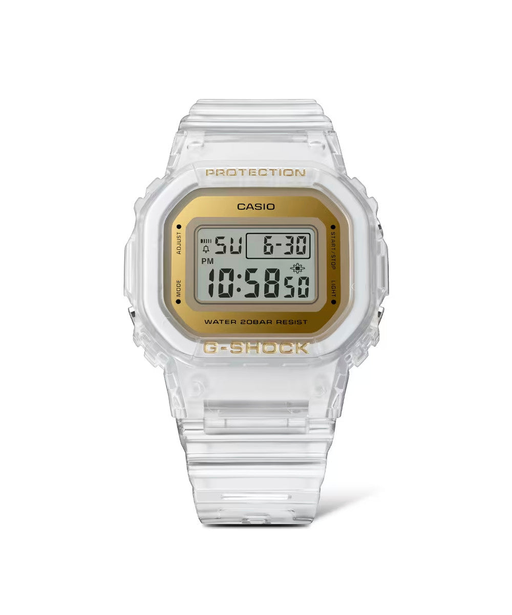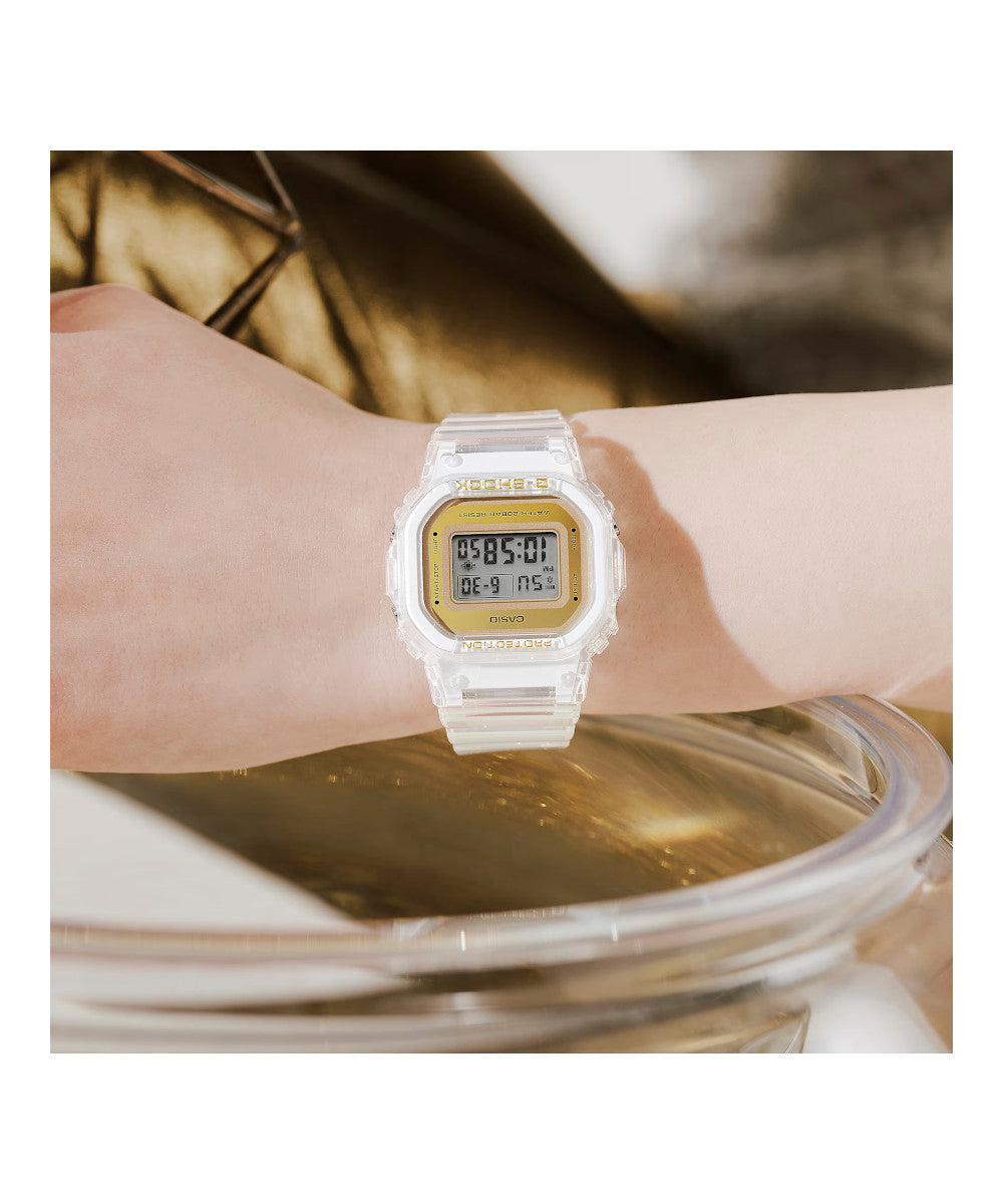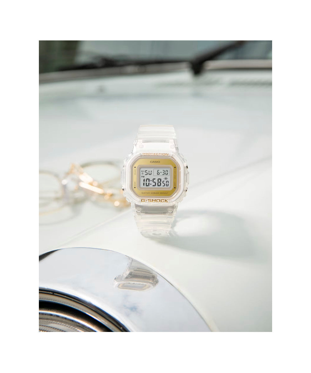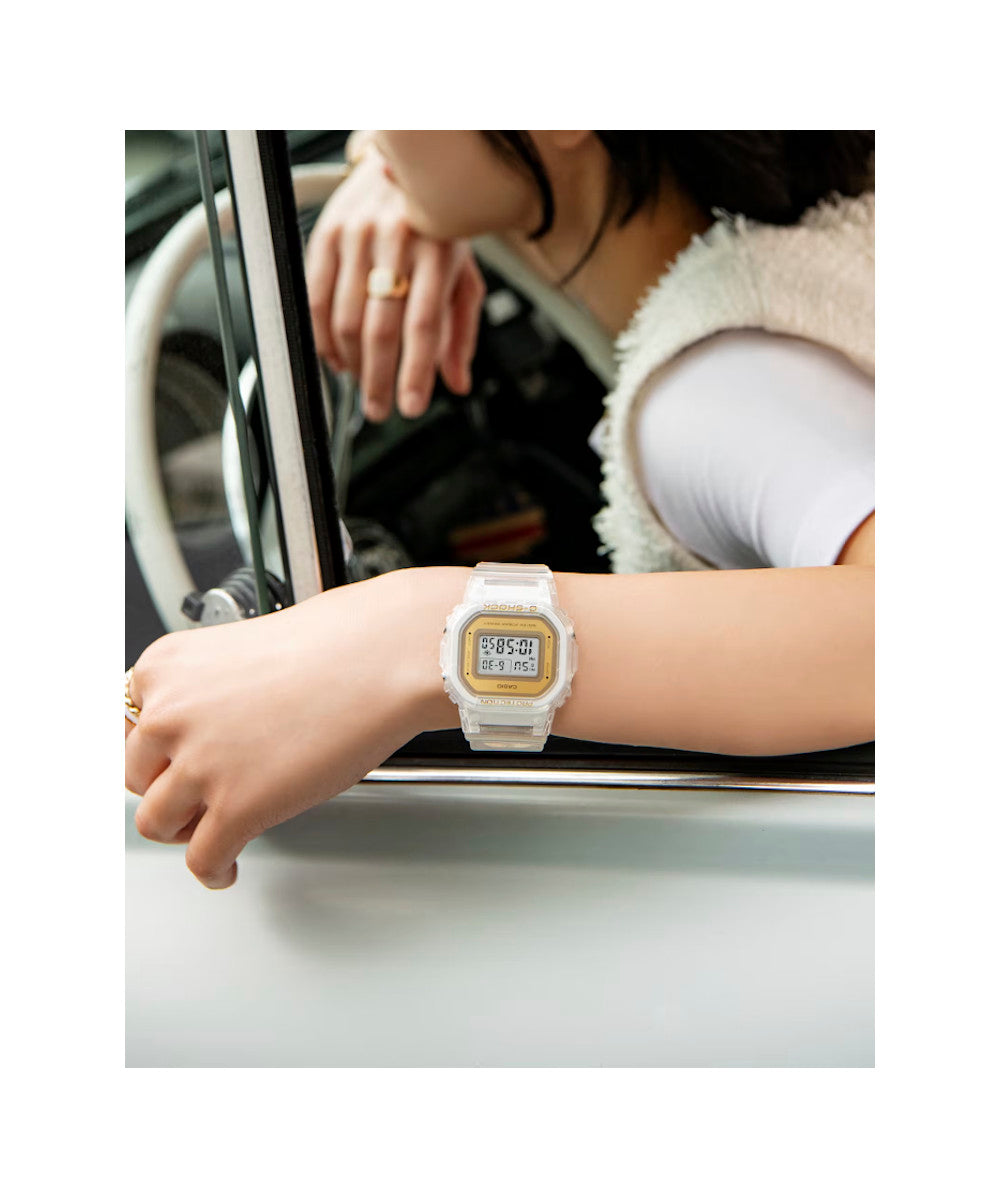 El GMD-S5600SG-7DR combina el diseño cuadrado clásico del G-SHOCK original con un tamaño más compacto, ideal para muñecas pequeñas. Su acabado blanco con detalles dorados aporta un toque moderno y elegante sin perder la esencia resistente de la marca.