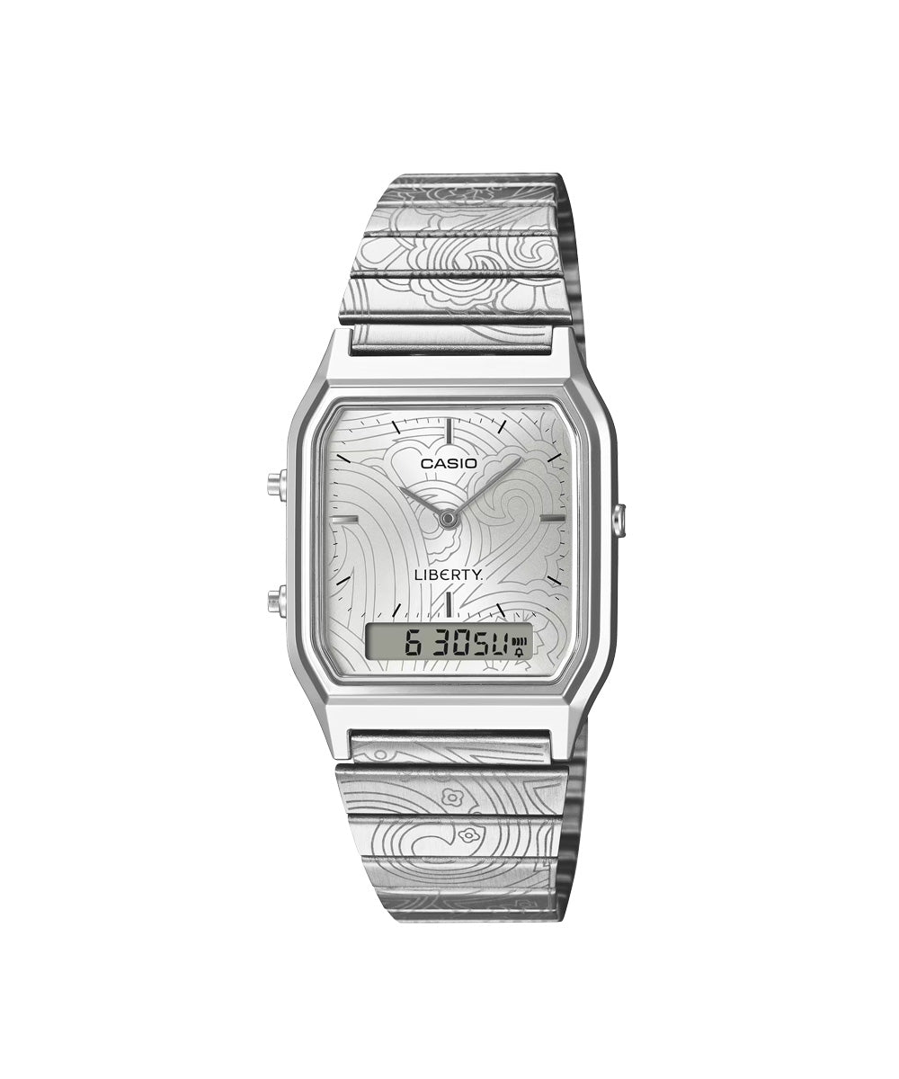 Presentamos el clásico Casio en exuberante y sofisticado paisley de la casa británica de diseño de lujo Liberty. Para esta singular colaboración, vestimos el popular AQ-230, con su esfera angular y su pantalla analógico-digital, con un estampado inspirado en el famoso Liberty Paisley Fanfare. Las líneas angulosas del reloj contrastan con las bellas curvas del clásico estampado paisley de la correa y la esfera, con elaborados detalles grabados a láser. Completado con el logotipo Liberty grabado en la hebilla y el fondo de la caja, y un embalaje especial diseñado en una Fanfarria Paisley, la meticulosa atención a cada detalle hace de este un reloj digno de una colaboración Casio×Liberty. Elija su combinación de colores favorita -caja plateada con correa plateada o caja gris plomo y correa negra- en un versátil diseño unisex que combina a la perfección con cualquier estilo.