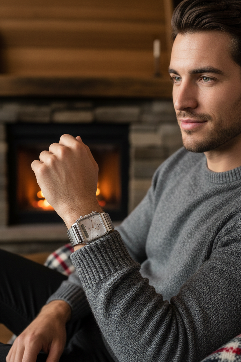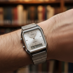 | Tipo de reloj | Reloj análogo‑digital rectangular: parte superior con agujas, parte inferior con pantalla digital. |