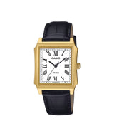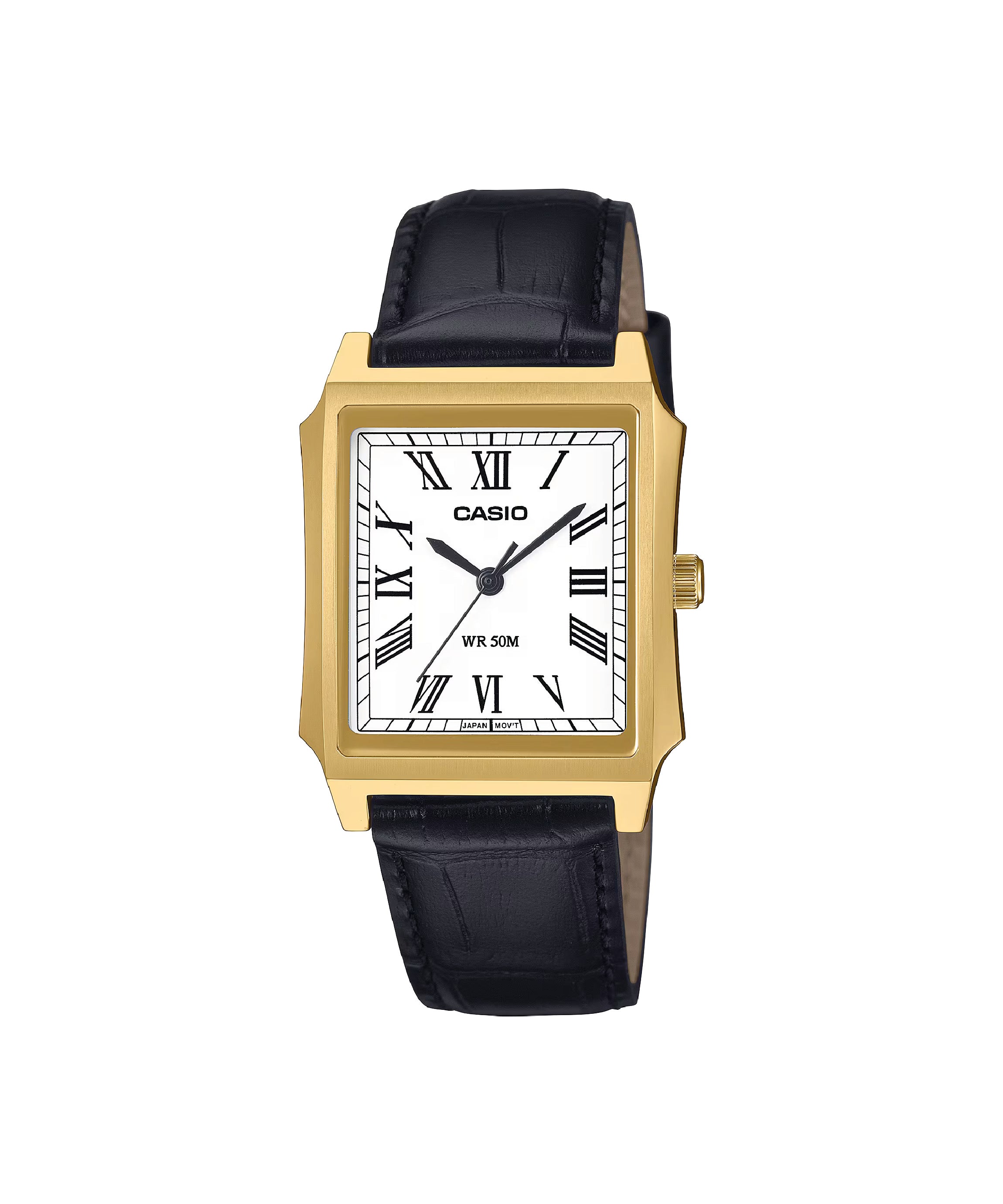 El Casio MTP-B190GL-7BVDF es un reloj analógico clásico para hombre con caja rectangular de acero inoxidable dorado (chapado en oro iónico), esfera blanca con números romanos y correa de cuero genuino negro. Funciona con movimiento de cuarzo de 3 agujas, ofrece cristal mineral, resistencia al agua de 50 metros y un tamaño compacto y ligero de 41 × 31,5 × 8,1 mm y 43 g, ideal como reloj de vestir para uso diario