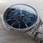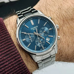 | Funciones especiales | Esfera azul con acabado metálico tipo cronógrafo y tres subesferas, cristal mineral, caja y brazalete de acero inoxidable plateado, cierre desplegable de triple pliegue y diseño elegante deportivo (48 × 41 × 10,6 mm; 116 g). |