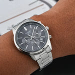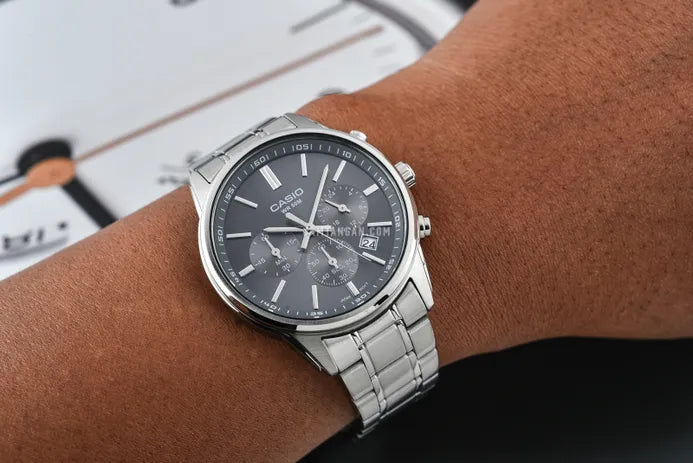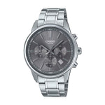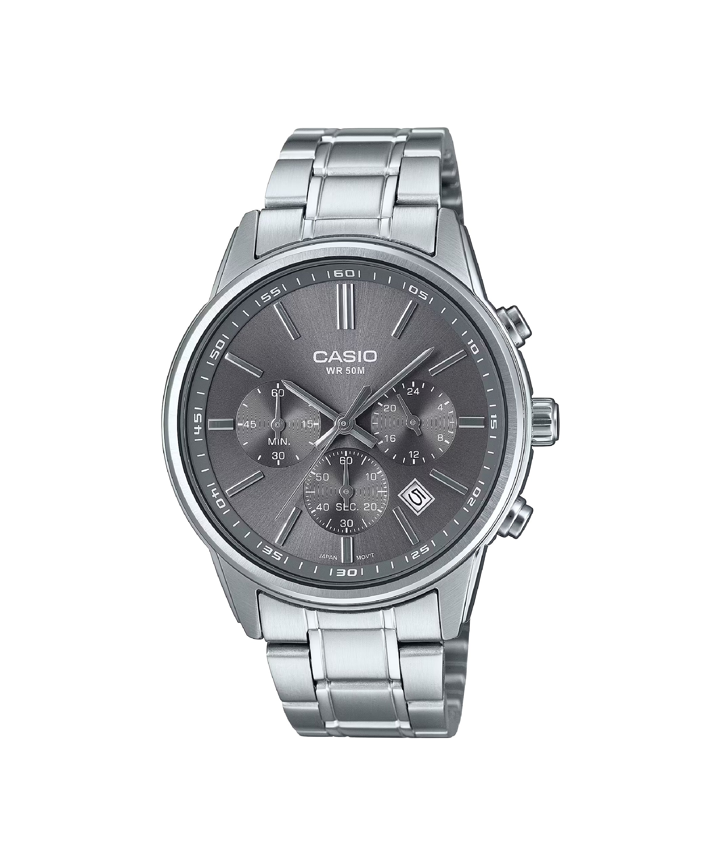 El Casio MTP-E515D-8AVDF es un reloj cronógrafo para hombre con caja y brazalete de acero inoxidable, esfera gris y tres subesferas que muestran formato 24 h y cronómetro de segundos y minutos. Ofrece movimiento de cuarzo preciso, cristal mineral y resistencia al agua de 50 metros, combinando un diseño deportivo y elegante ideal para uso diario y ocasiones formales.