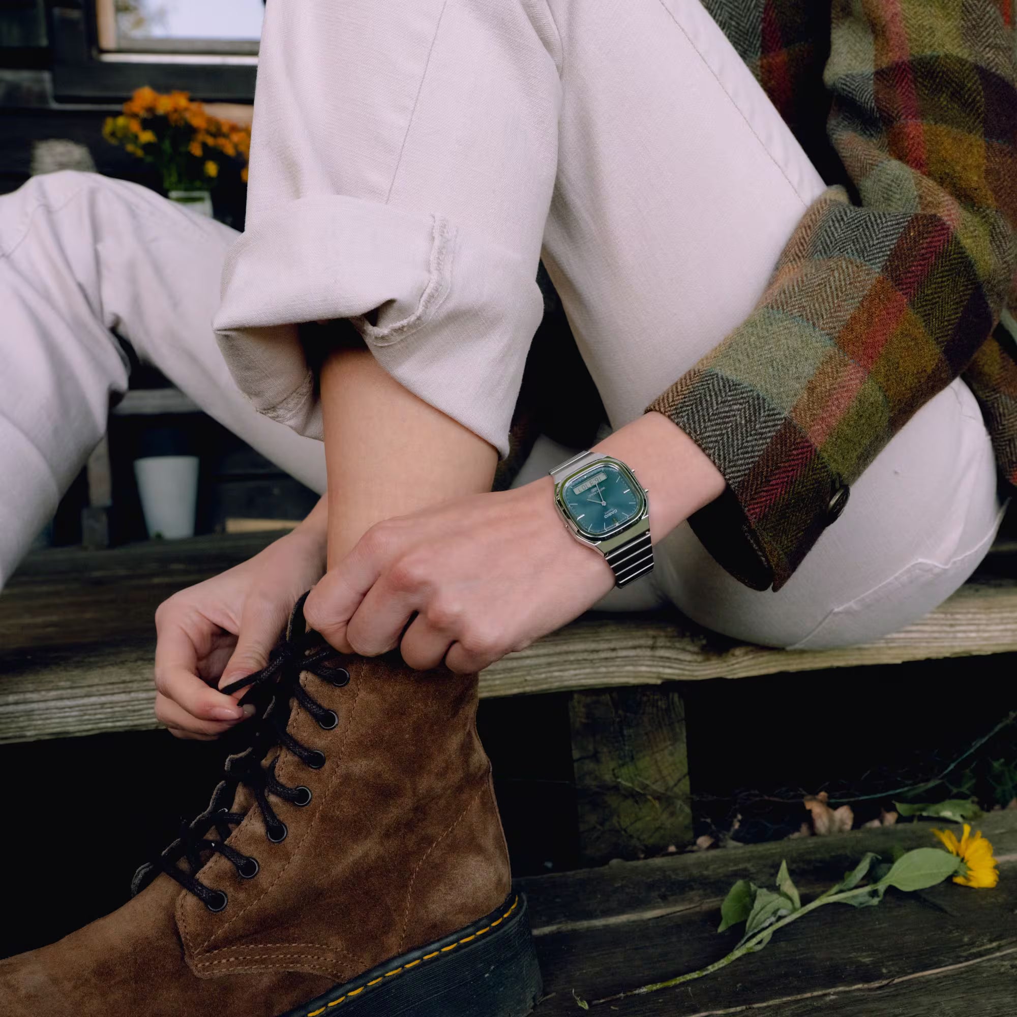 Funciones especiales Diseño retro-moderno con carátula verde azulado (blue-green) y acabado sunray que refleja la luz con brillo refinado, caja de resina ligeramente rectangular con curvas suaves, correa de acero inoxidable con eslabones horizontales alargados, pantalla LCD digital a las 6 en punto con excelente legibilidad, índices metálicos delgados que combinan estética vintage con toque contemporáneo, diseño unisex versátil y ligero, correa autoajustable, duración de batería aproximada de 3 años