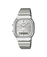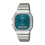 El Casio AQ-240E-3ADF es un reloj analógico-digital de la colección Vintage que destaca por su distintiva carátula verde azulado (blue-green) con acabado sunray que crea una impresión refinada y moderna. Con caja ligeramente rectangular de curvas suaves, correa de acero inoxidable con eslabones horizontales alargados y pantalla digital integrada armónicamente, este modelo unisex ofrece funciones prácticas como dual time, cronómetro, calendario perpetuo y alarma, ideal para añadir un toque de color y personalidad a cualquier look con estilo vintage-contemporáneo.