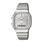 El Casio AQ-240E-7ADF es un reloj analógico-digital de la colección Vintage que combina un diseño retro-moderno sofisticado con una elegante carátula plateada de acabado sunray. Con caja ligeramente rectangular de curvas suaves, correa de acero inoxidable con eslabones horizontales alargados y pantalla digital integrada armónicamente a las 6 en punto, este modelo unisex ofrece funciones prácticas como dual time, cronómetro, calendario perpetuo y alarma, ideal para complementar cualquier estilo con elegancia atemporal.