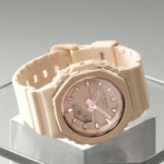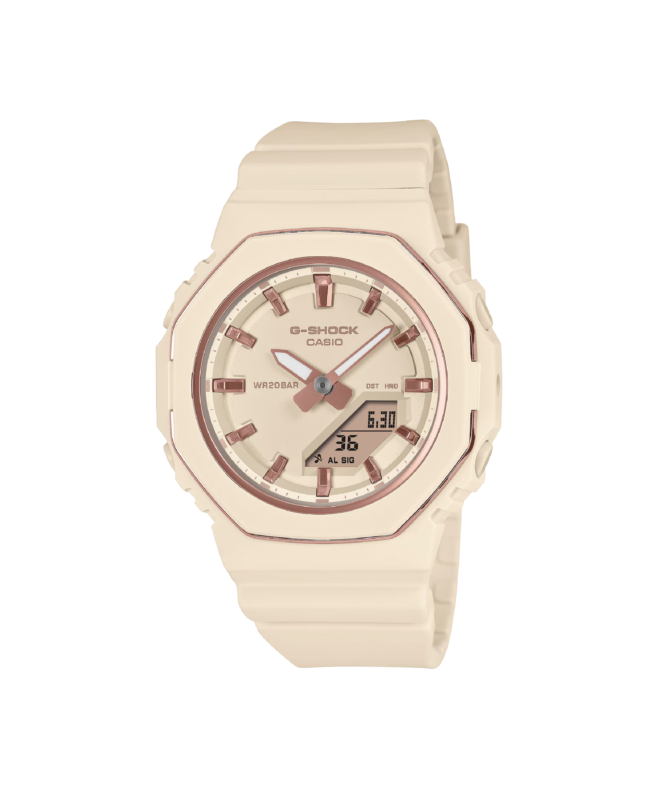 | Funciones especiales | Caja y bisel octogonales de resina/bioresina con anillo metálico en acabado brillante, correa de bio-resina en tono rosa/beige, construcción resistente a los golpes, tamaño compacto 46 × 40,5 × 11,3 mm y peso ligero de 37 g. |