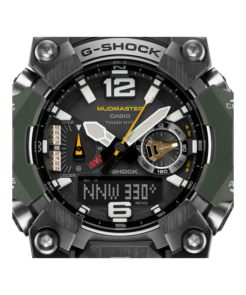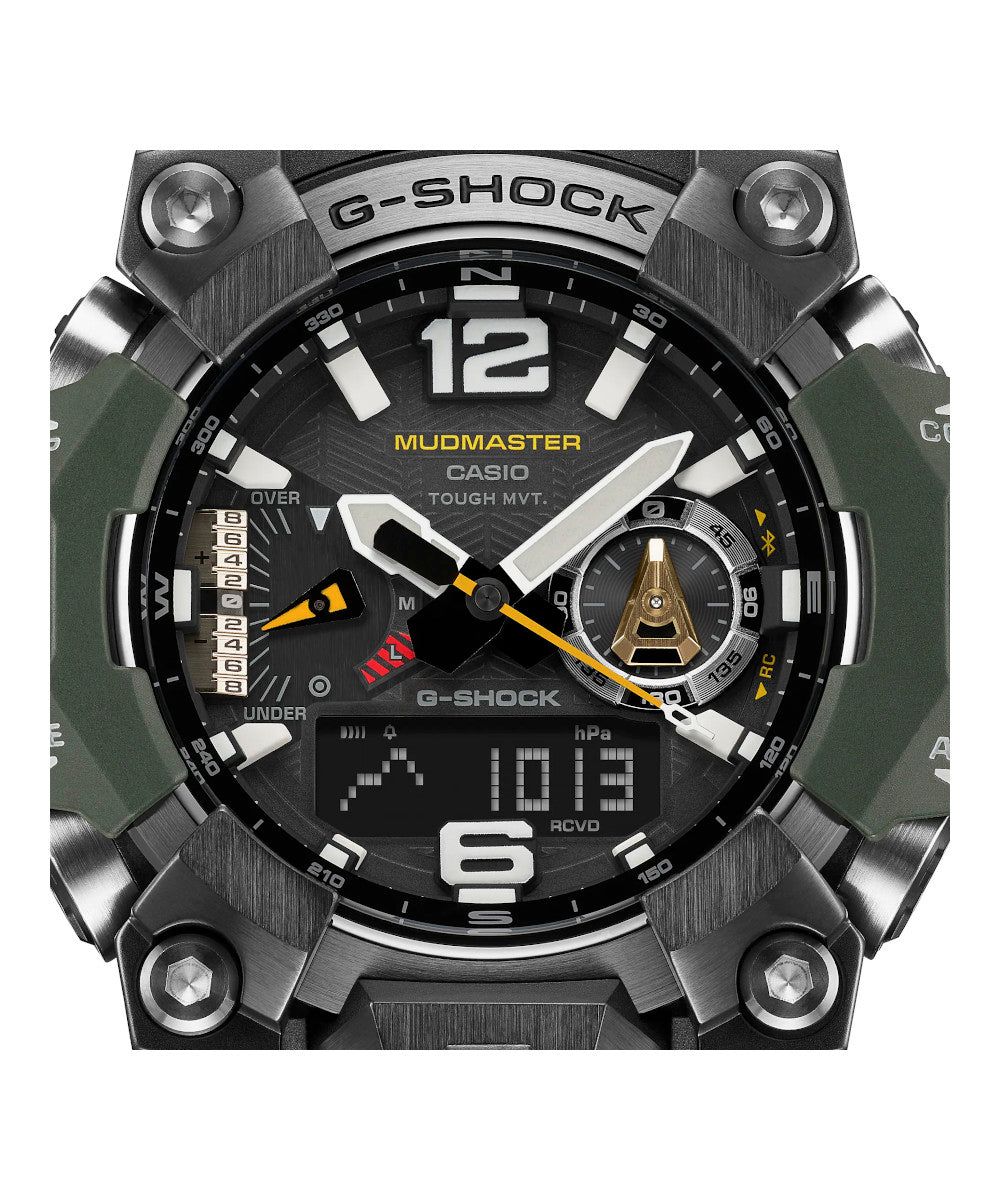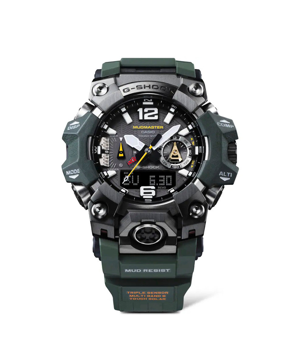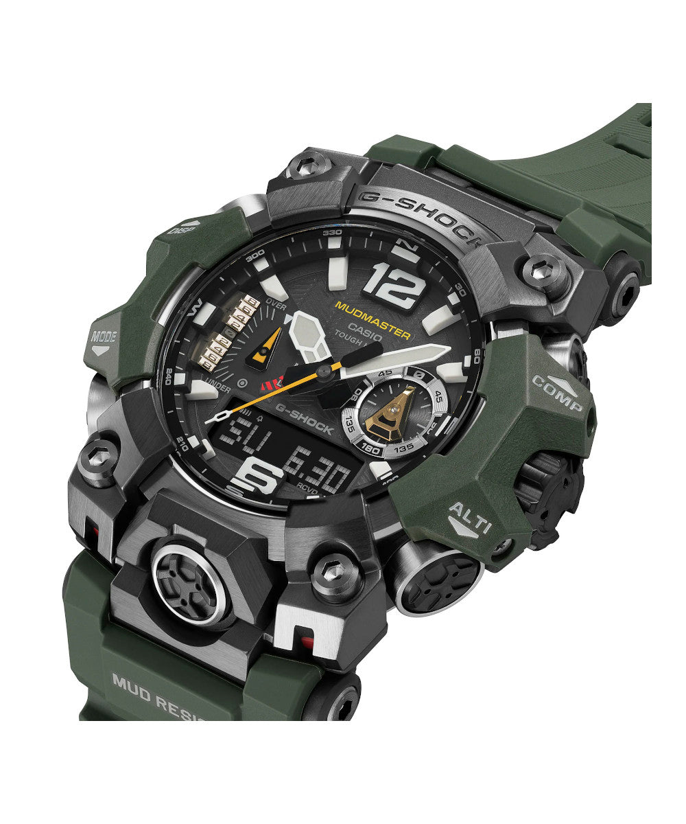 Este reloj ofrece un ajuste más cómodo y una durabilidad excepcional con un exterior robusto que incorpora una estructura de protección construida con componentes metálicos. Los relojes de la línea G-SHOCK Master of G, desarrollados para profesionales que trabajan en los entornos más hostiles, vienen equipados con una funcionalidad aún más resistente. Y el MUDMASTER lleva esto aún más lejos con la capacidad de manejar los entornos terrestres más difíciles, ganándose el reconocimiento y la confianza de los guardabosques y los equipos de rescate que operan en entornos extremos. El GWG-B1000 de tamaño cómodo presenta un exterior de metal elaborado con técnicas de forjado de alta precisión y una carcasa de resina reforzada con fibra de carbono que ofrece alta resistencia y durabilidad excepcional. El reloj, controlado por radio y alimentado por energía solar, también está equipado con un sensor triple que lo mantiene actualizado con lecturas de dirección, altitud, presión barométrica y temperatura