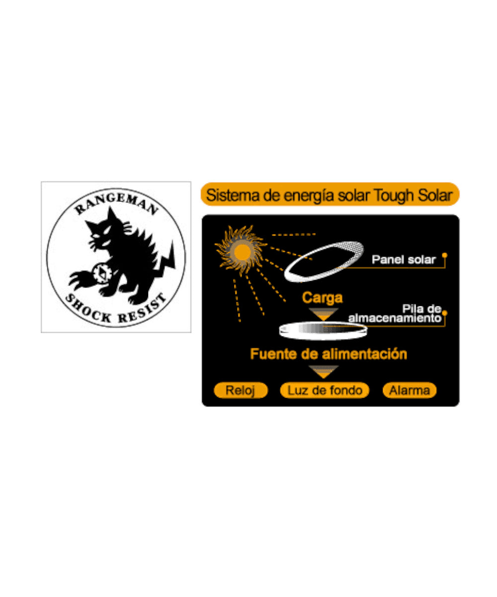FUNCIONES: El GW-9400 RANGEMAN está equipado con un sensor triple para entregar lecturas de altitud, dirección, temperatura y presión barométrica directamente en su muñeca. La estructura cilíndrica del protector del botón garantiza un funcionamiento suave y preciso del botón del sensor. Presione el botón del sensor y se mostrará instantáneamente el modo de sensor utilizado más recientemente. Tres tipos diferentes de pitidos indican diferentes modos de medición: útil para una operación sin mirar que libera su enfoque para aventuras difíciles.