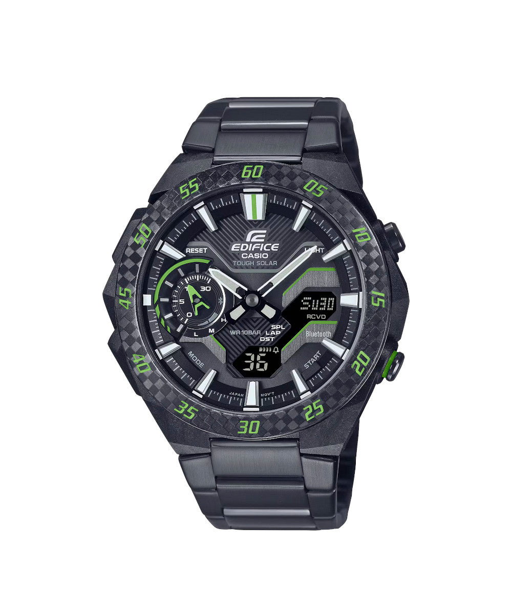 Presentamos la verdadera forma, funcionalidad y sofisticación de los deportes de motor: el EDIFICE SOSPENSIONE ECB-40, con diseño de brazo de suspensión de resina reforzada con fibra de carbono y Smartphone Link. El diseño único de la caja está inspirado en la suspensión de los autos de fórmula con orejetas configuradas en una disposición de cuatro brazos, dos arriba y dos abajo. La resina reforzada con fibra de carbono ofrece una carcasa ligera pero resistente. Gracias a Smartphone Link, este reloj especial se conecta automáticamente cuando está dentro del alcance de un teléfono inteligente emparejado. Toque la aplicación para acceder a funciones que son tan importantes para los equipos de carreras: ajuste automáticamente el cronometraje de precisión al segundo, administre sin esfuerzo el tiempo mundial y transfiera datos del cronómetro medidos al milisegundo para hasta 200 tiempos de vuelta a su teléfono inteligente.