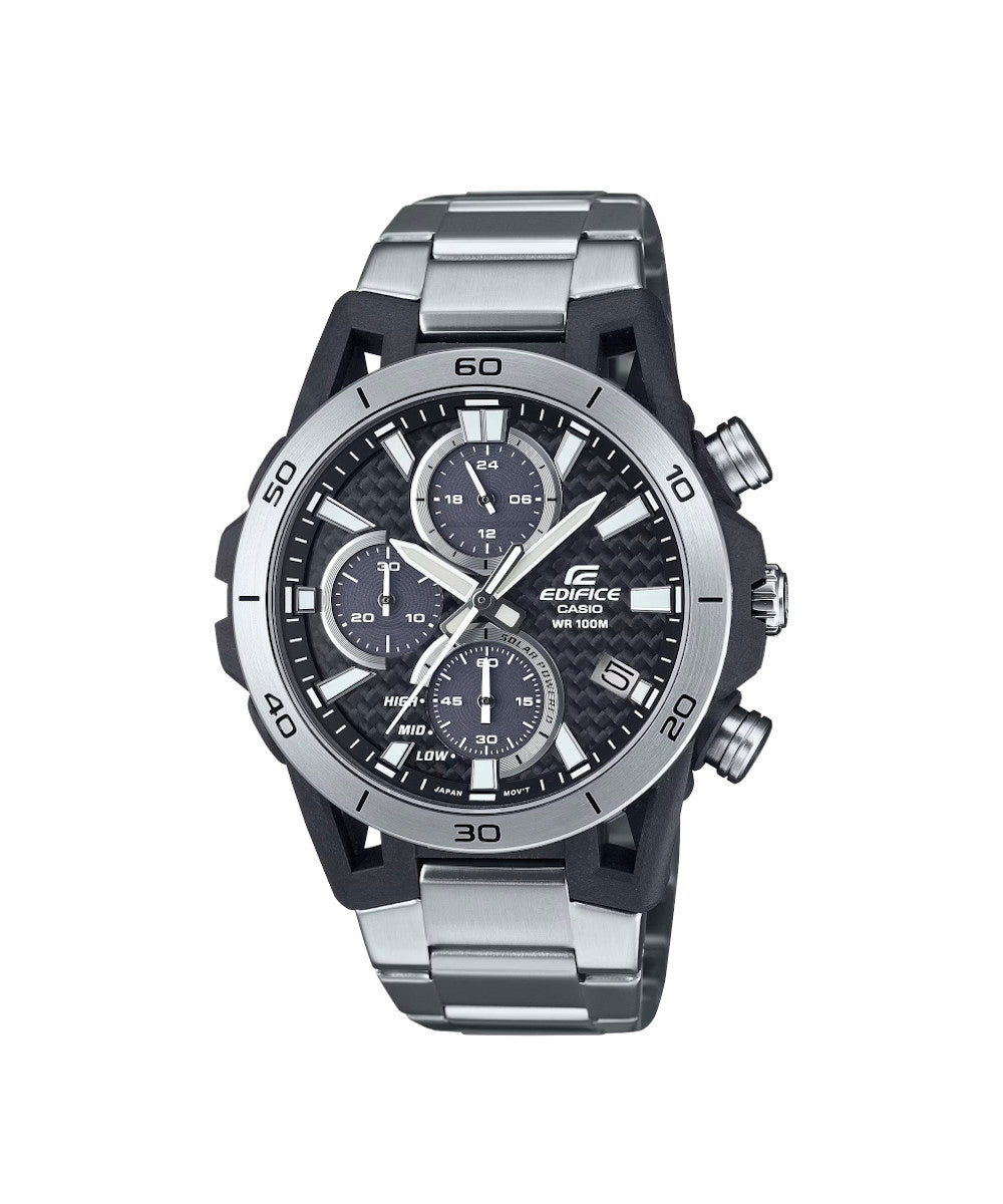 FUNCIONES: Reloj EDIFICE, 100 metros de resistencia al agua, cronógrafo, energía solar, indicador de fecha, caja y pulso en acero inoxidable.