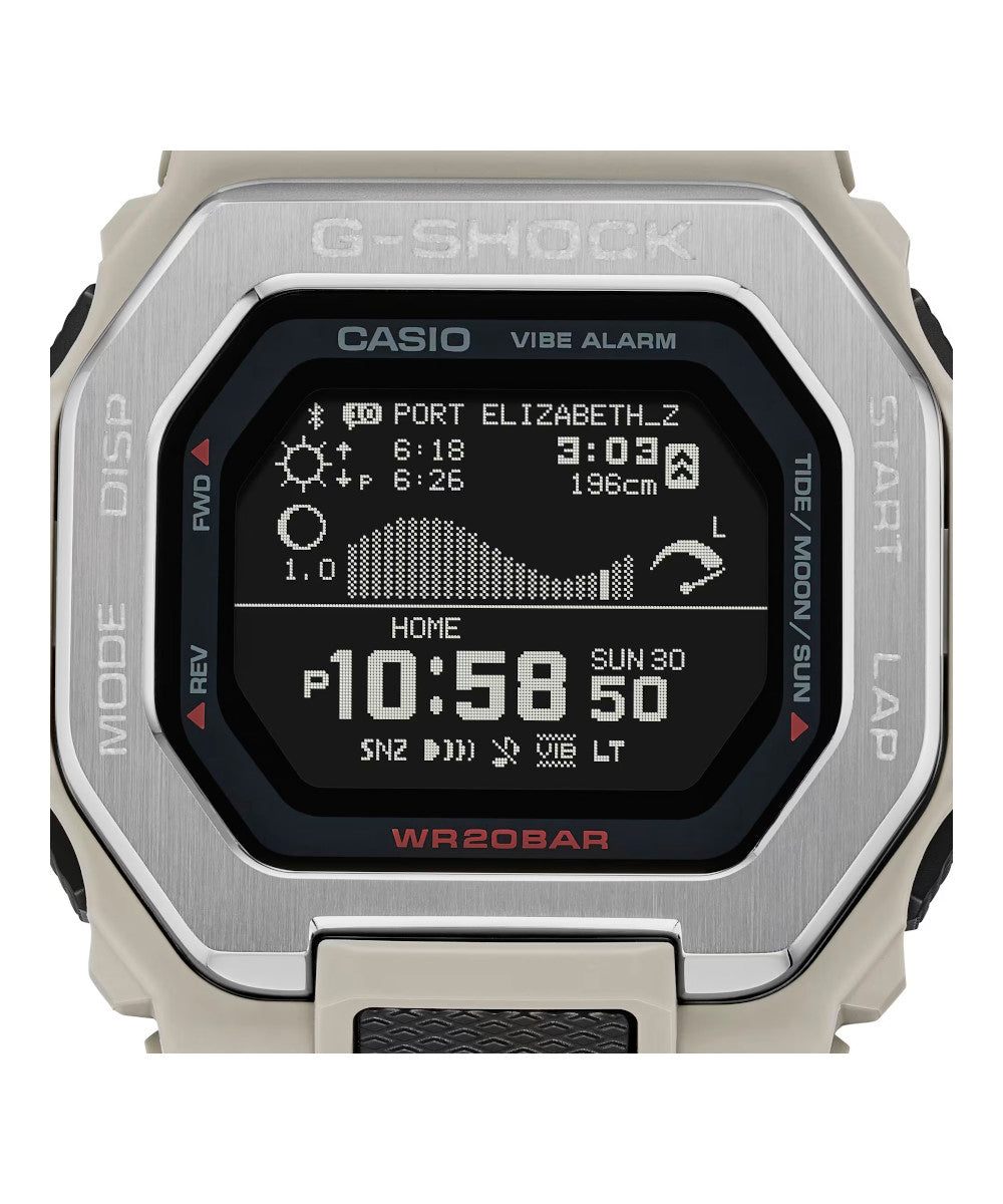 FUNCIONES: RELOJ G-SHOCK, resistencia al agua de 200 metros, resistente a impactos, cronómetro de 1/100 segundos, temporizador, formato de 12 y 24 horas, señal horaria, calendario automático 2099, Su capacidad de mostrar gráficos de mareas, datos lunares, niveles y horas de pleamar/bajamar y horas de salida/puesta del sol es útil para los surfistas, ya que les permite comprender el estado de la marea en detalle de un vistazo, que se combina bien con las funciones de medición de entrenamiento