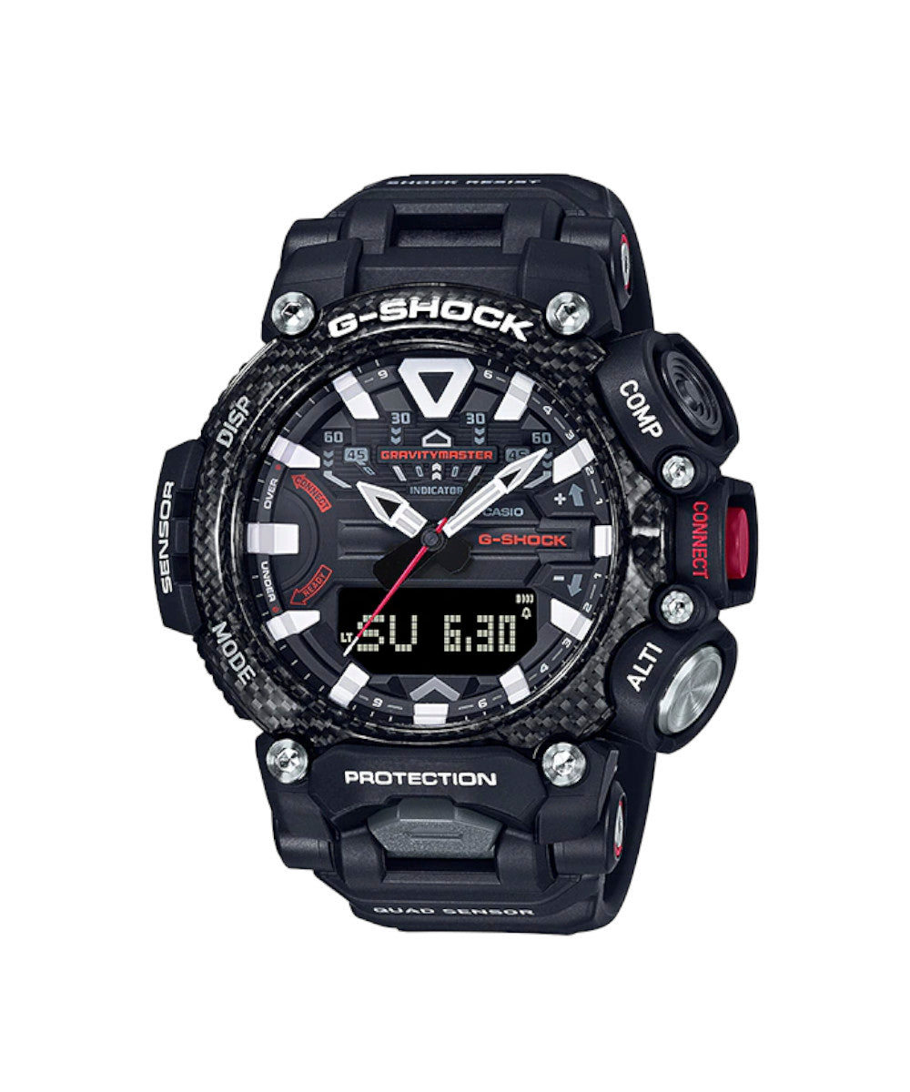 FUNCIONES: RELOJ G-SHOCK, resistencia al agua de 200 metros, resistente a impactos, iluminación de neón, contador de pasos, Sensor con brújula, altímetro/barómetro, lector de temperatura y podómetro, 5 alarmas diarias, hora mundial, cronómetro de 1/100 segundos, temporizador, formato de 12 y 24 horas, señal horaria, calendario automático 2099.
