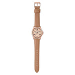 FUNCIONES: Caja con baño de iones de oro rosa, Resistencia al agua de 50 metros, Banda de cuero, Indicador de fecha, día y 24 horas,