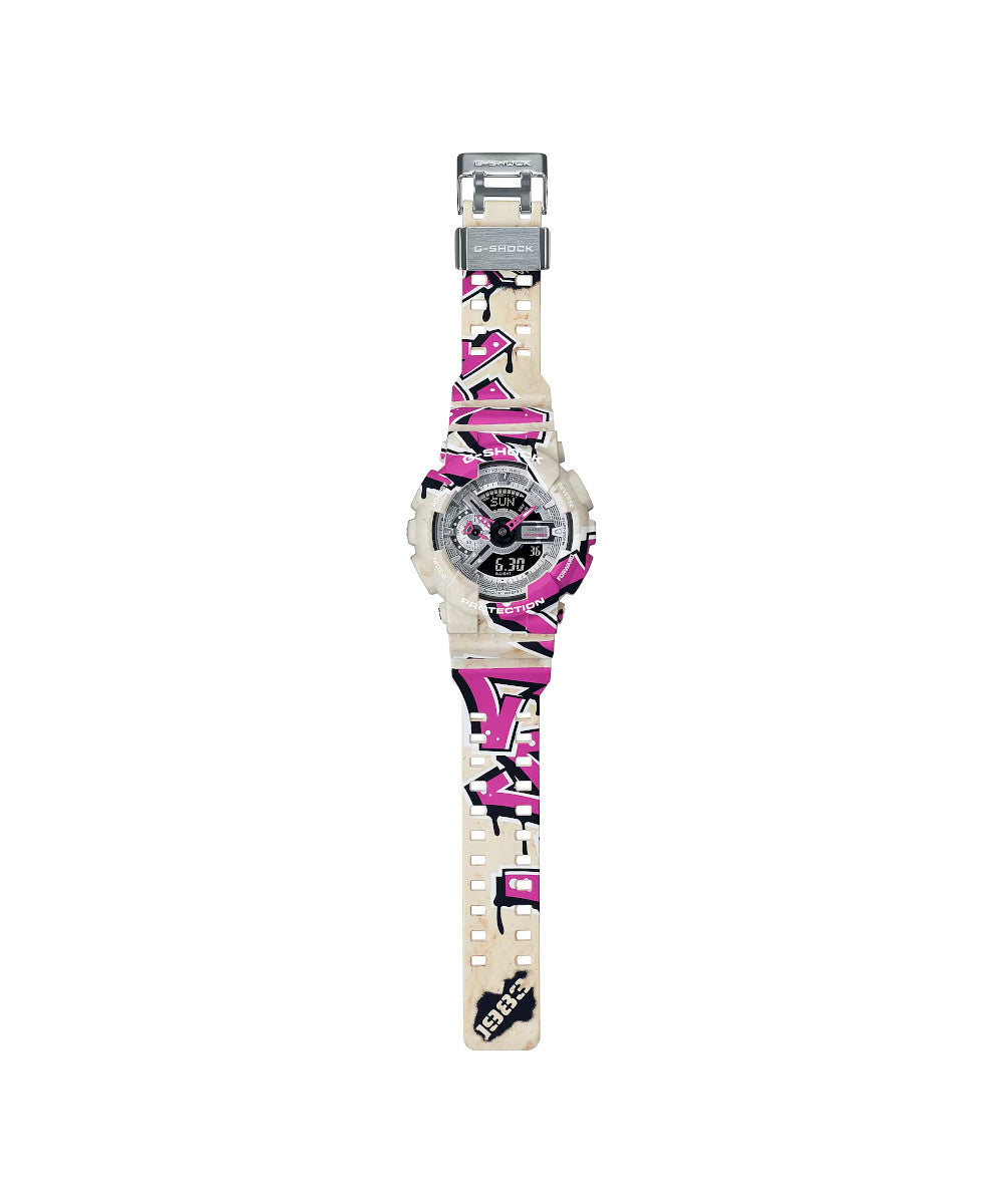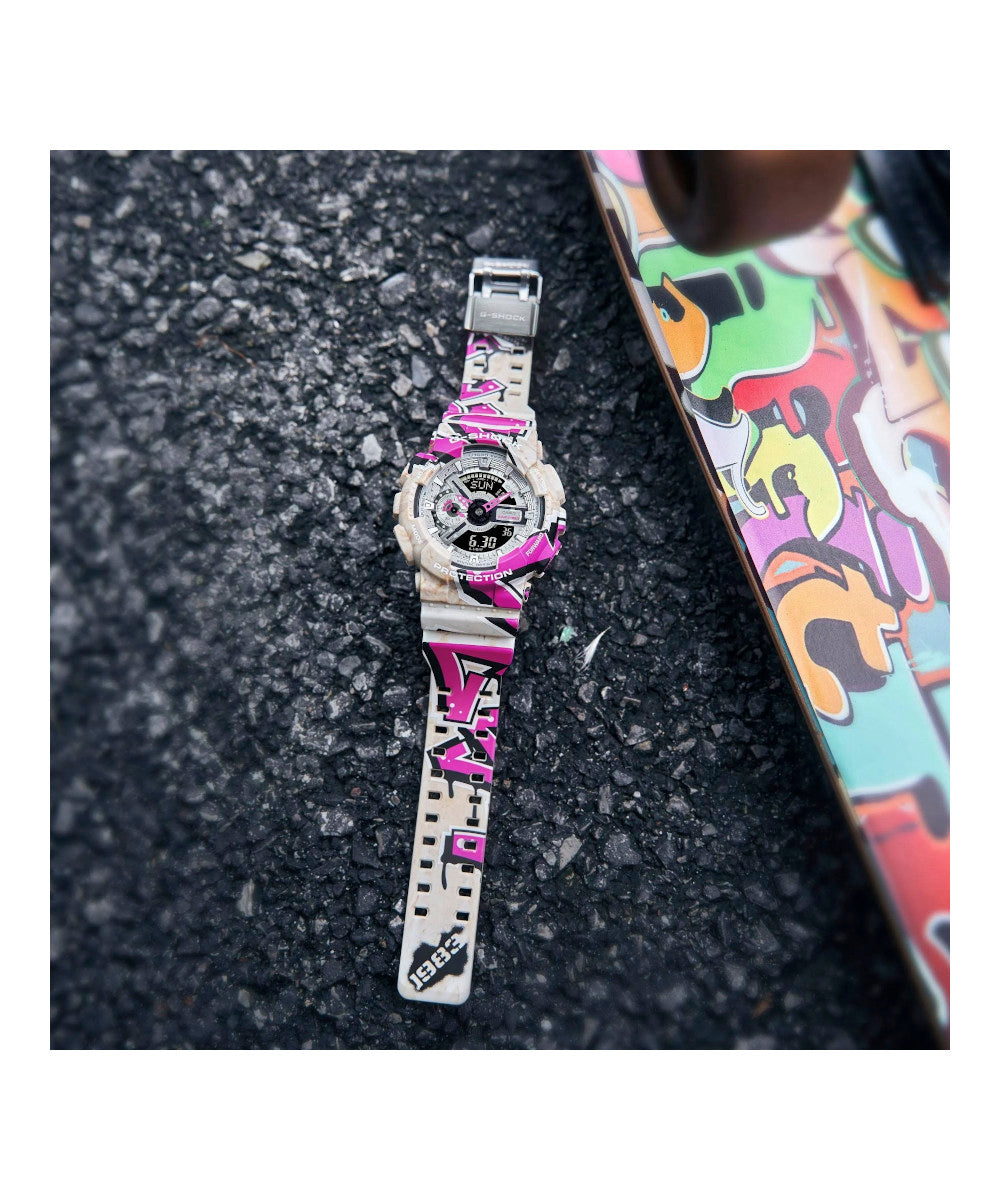 Estos diseños de la calle, aplicados de forma llamativa en la caja y la correa, presentan un original arte de grafiti que causará sensación en la escena de la moda.