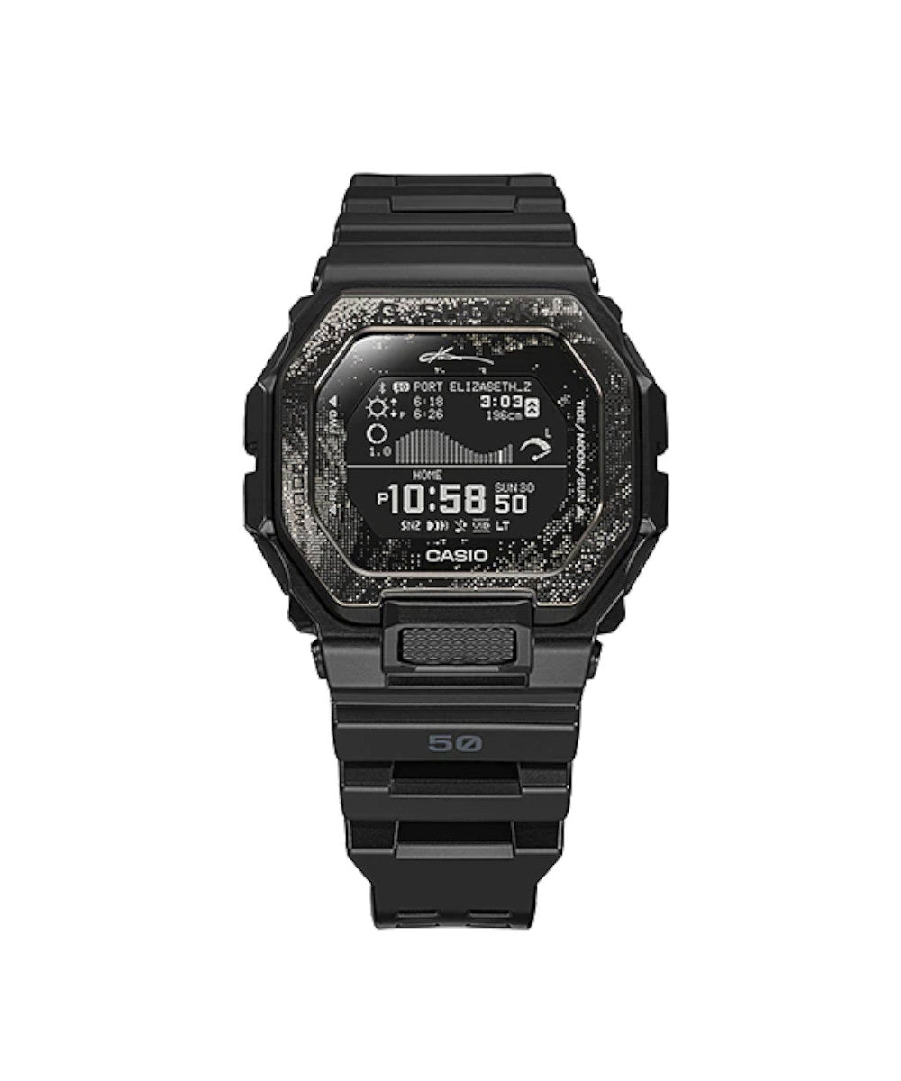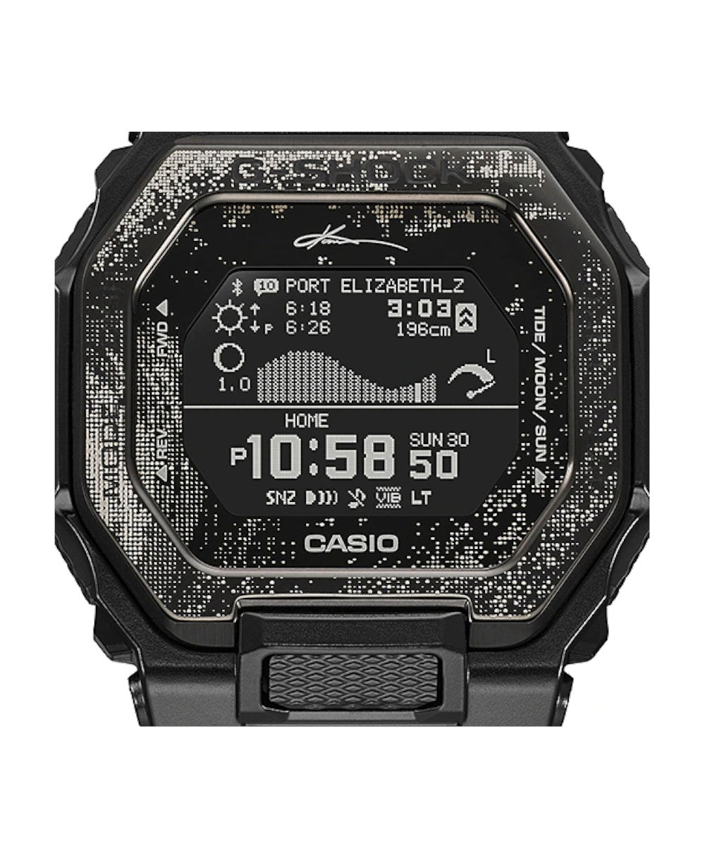 FUNCIONES: RELOJ G-SHOCK, resistencia al agua de 200 metros, resistente a impactos, cronómetro de 1/100 segundos, temporizador, formato de 12 y 24 horas, señal horaria, calendario automático 2099, Su capacidad de mostrar gráficos de mareas, datos lunares, niveles y horas de pleamar/bajamar y horas de salida/puesta del sol es útil para los surfistas, ya que les permite comprender el estado de la marea en detalle de un vistazo, que se combina bien con las funciones de medición de entrenamiento