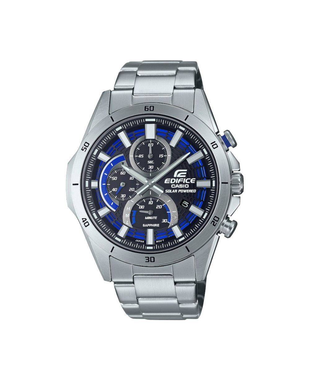 FUNCIONES: Reloj EDIFICE, 100 metros de resistencia al agua, cronómetro 1 /10 segundos, indicador de fecha, caja en acero inoxidable, cristal zafiro, Delgado, deportivo y con funcionamiento a energía solar.BATERÍA: Carga solar