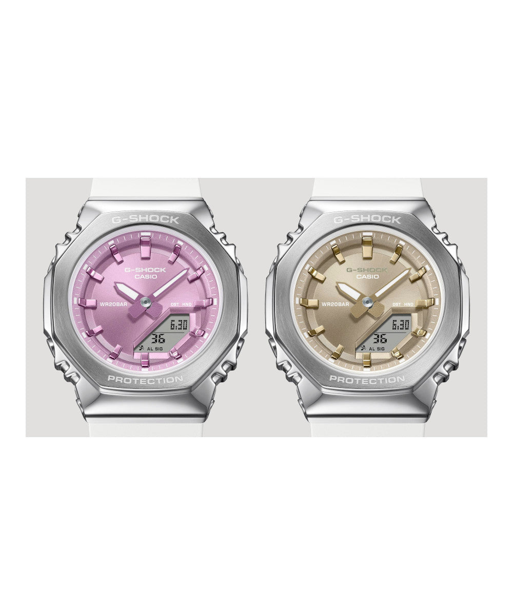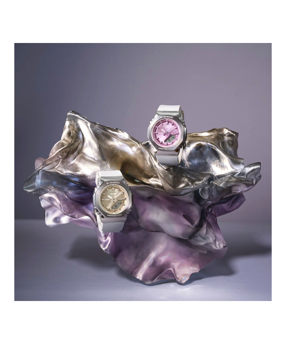 El Casio G-SHOCK GM-S2110-7A9DR combina elegancia y resistencia en un diseño compacto para mujer. Con bisel metálico dorado, correa blanca y resistencia al agua 200 m, une moda, estilo y la dureza G-SHOCK en un solo reloj.