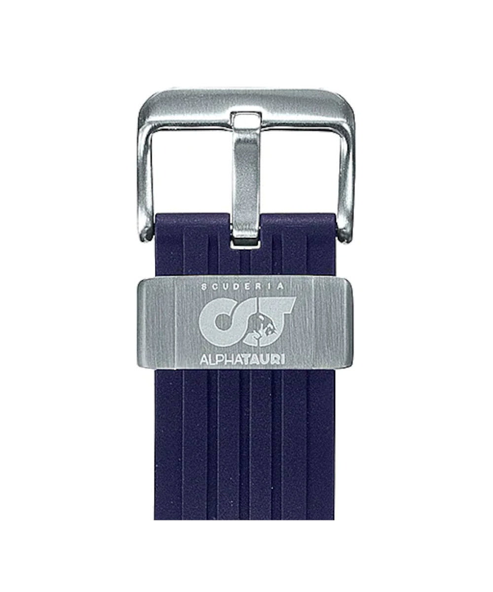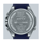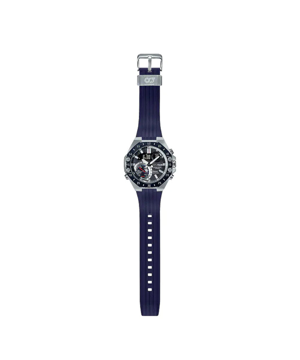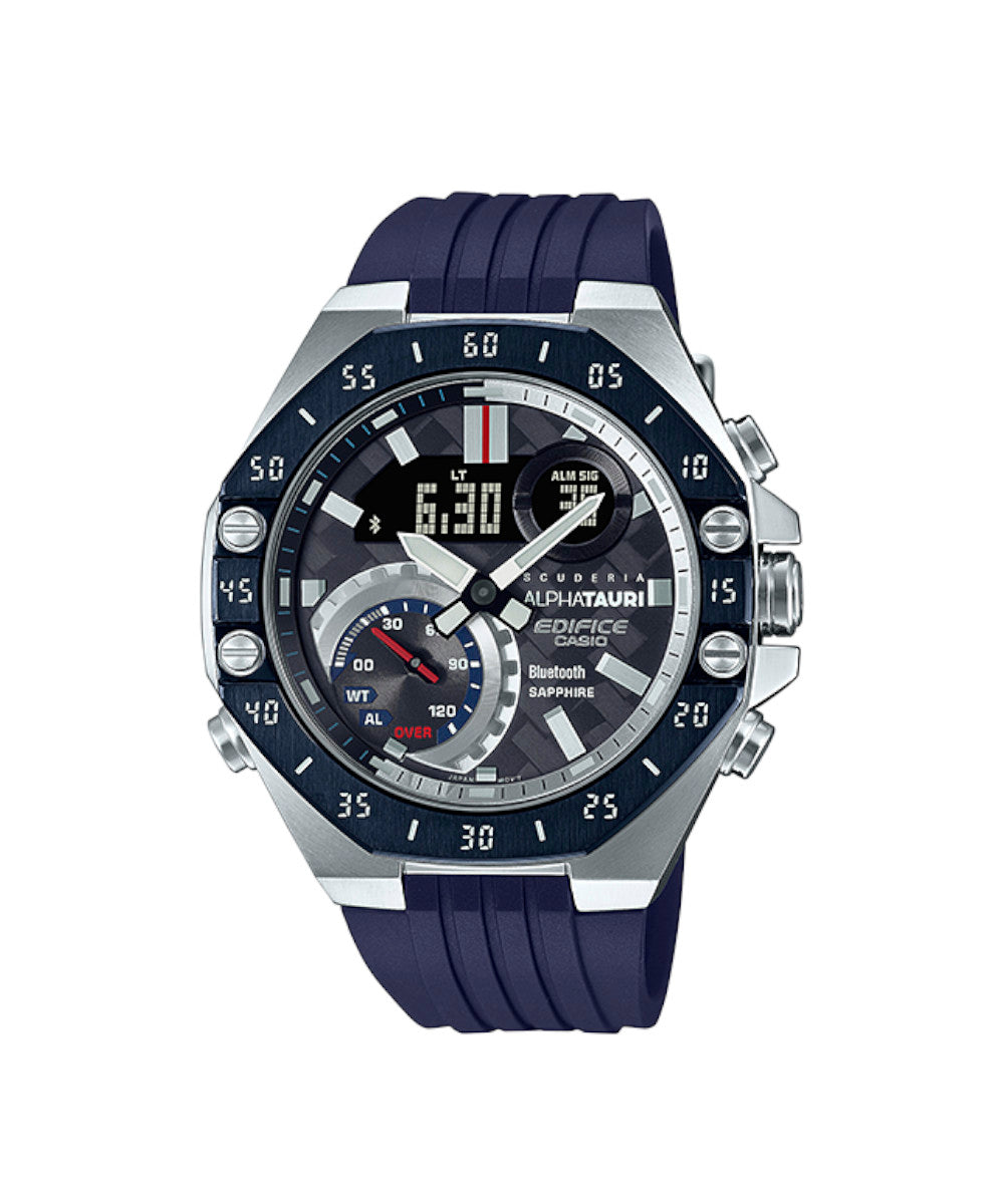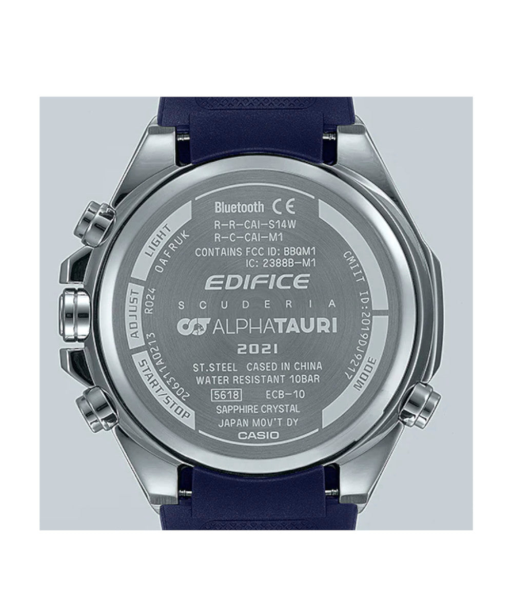 EDIFICE Scuderia AlphaTauri de edición limitada | Vinculación con smartphone | Un modelo de colaboración con el equipo de F1 Scuderia AlphaTauri de “EDIFICE”. Se utiliza carbono seco de 6K elaborado de fibra de carbono de alto grado para el dial. El carbono 6K también se utiliza para el alerón y el piso de los automóviles de F1. El color se basa en el esquema de color azul marino del equipo. El logotipo del equipo está incluido en el dial, en la parte posterior de la carcasa y en el retenedor de correa. Está equipado con funciones desarrolladas en función de los comentarios del equipo. Un modelo de combinación analógico-digital basado en el modelo ECB-10 con vinculación con smartphone. Está equipado con un temporizador de agenda que brinda asistencia a los miembros del equipo que tienen que administrar los horarios minuto a minuto durante la semana de la carrera. Este modelo ayuda al equipo a través de la función de hora mundial con precisión de una fracción de segundo.