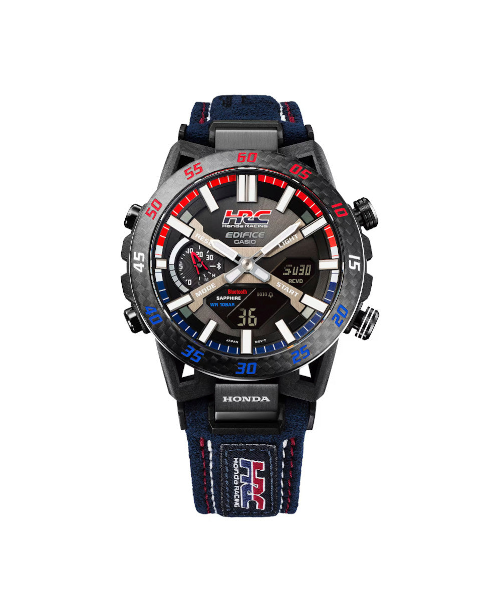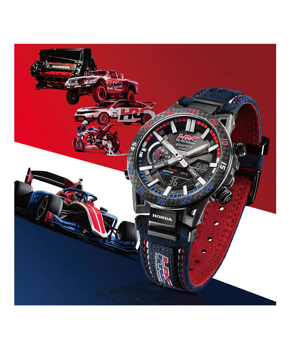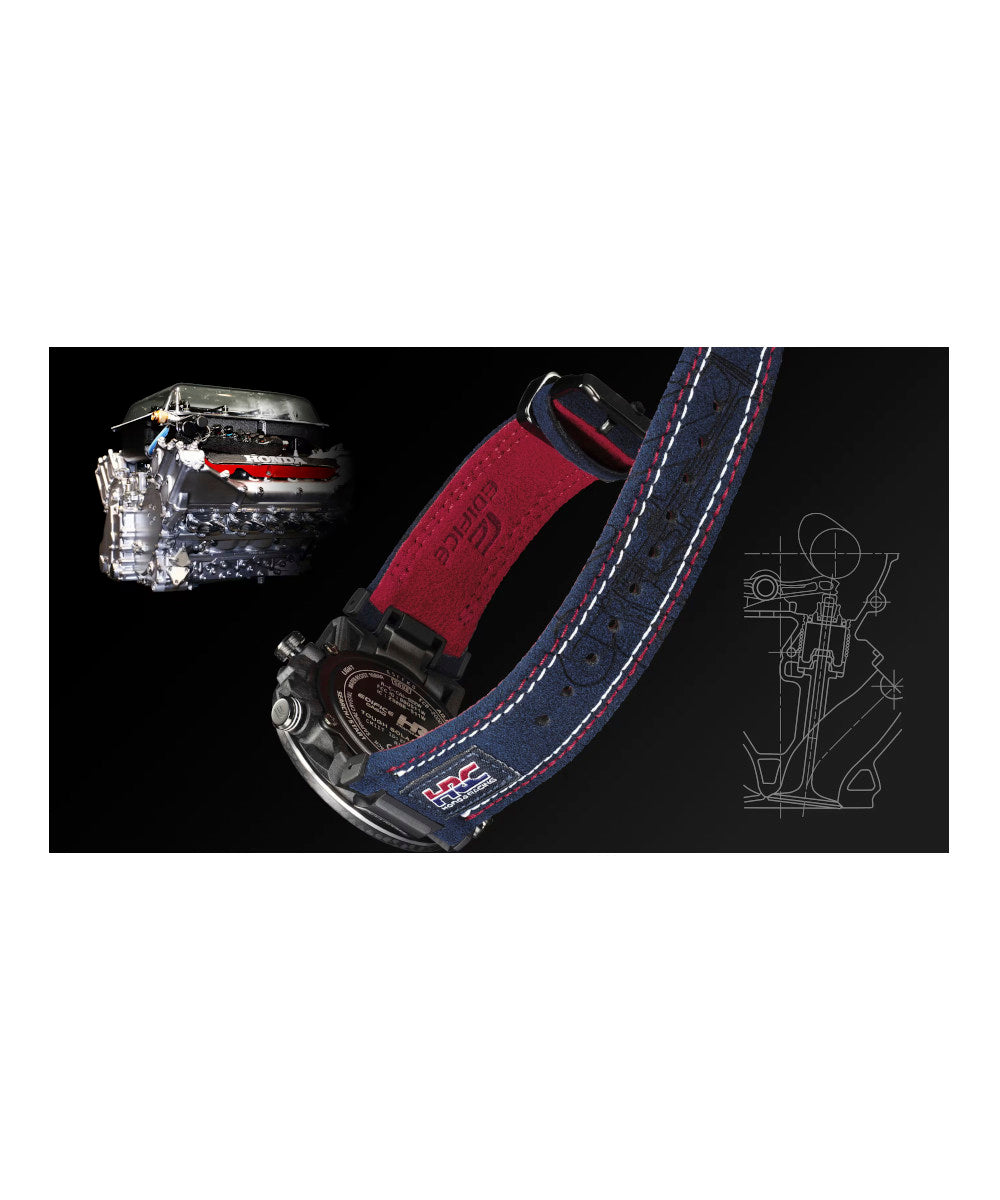 FUNCIONES: Diseño de caja único con un motivo inspirado en la suspensión de los autos de fórmula. Al igual que la suspensión de cuatro brazos que se usa en los autos de carreras, con dos brazos arriba y dos abajo, las orejetas están configuradas en una disposición de cuatro brazos. Por primera vez en la línea EDIFICE, se utiliza resina reforzada con fibra de carbono para la caja. Aprovechando la combinación característica de resistencia y ligereza del material, el reloj ofrece la durabilidad y el ajuste para soportar incluso el uso intensivo por parte de los mecánicos de carreras..