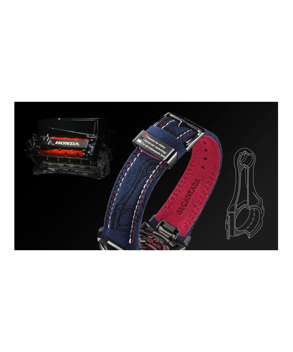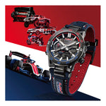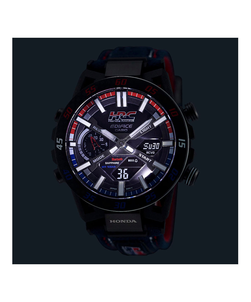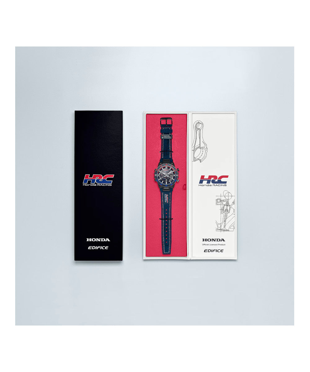 FUNCIONES: Diseño de caja único con un motivo inspirado en la suspensión de los autos de fórmula. Al igual que la suspensión de cuatro brazos que se usa en los autos de carreras, con dos brazos arriba y dos abajo, las orejetas están configuradas en una disposición de cuatro brazos. Por primera vez en la línea EDIFICE, se utiliza resina reforzada con fibra de carbono para la caja. Aprovechando la combinación característica de resistencia y ligereza del material, el reloj ofrece la durabilidad y el ajuste para soportar incluso el uso intensivo por parte de los mecánicos de carreras..