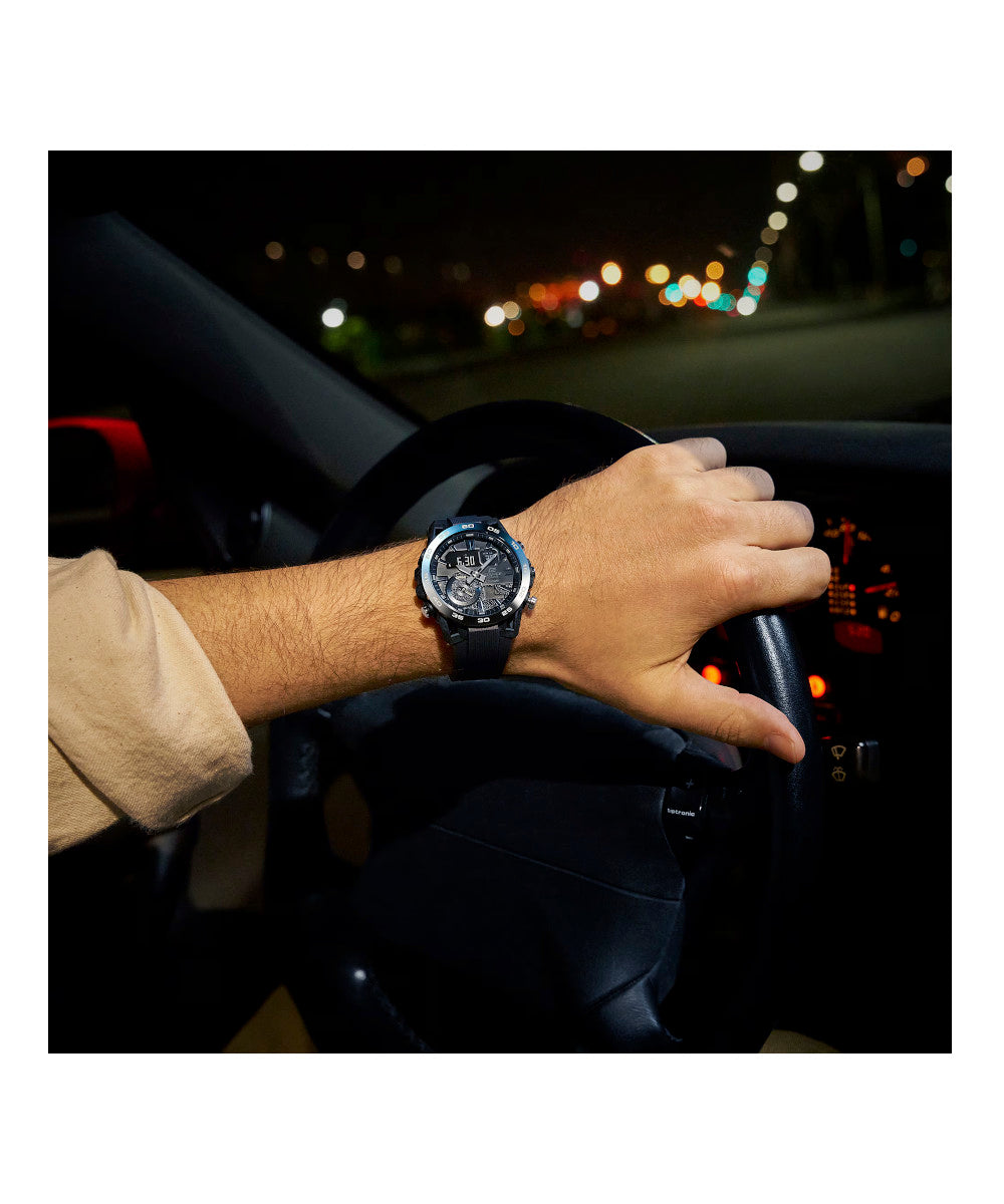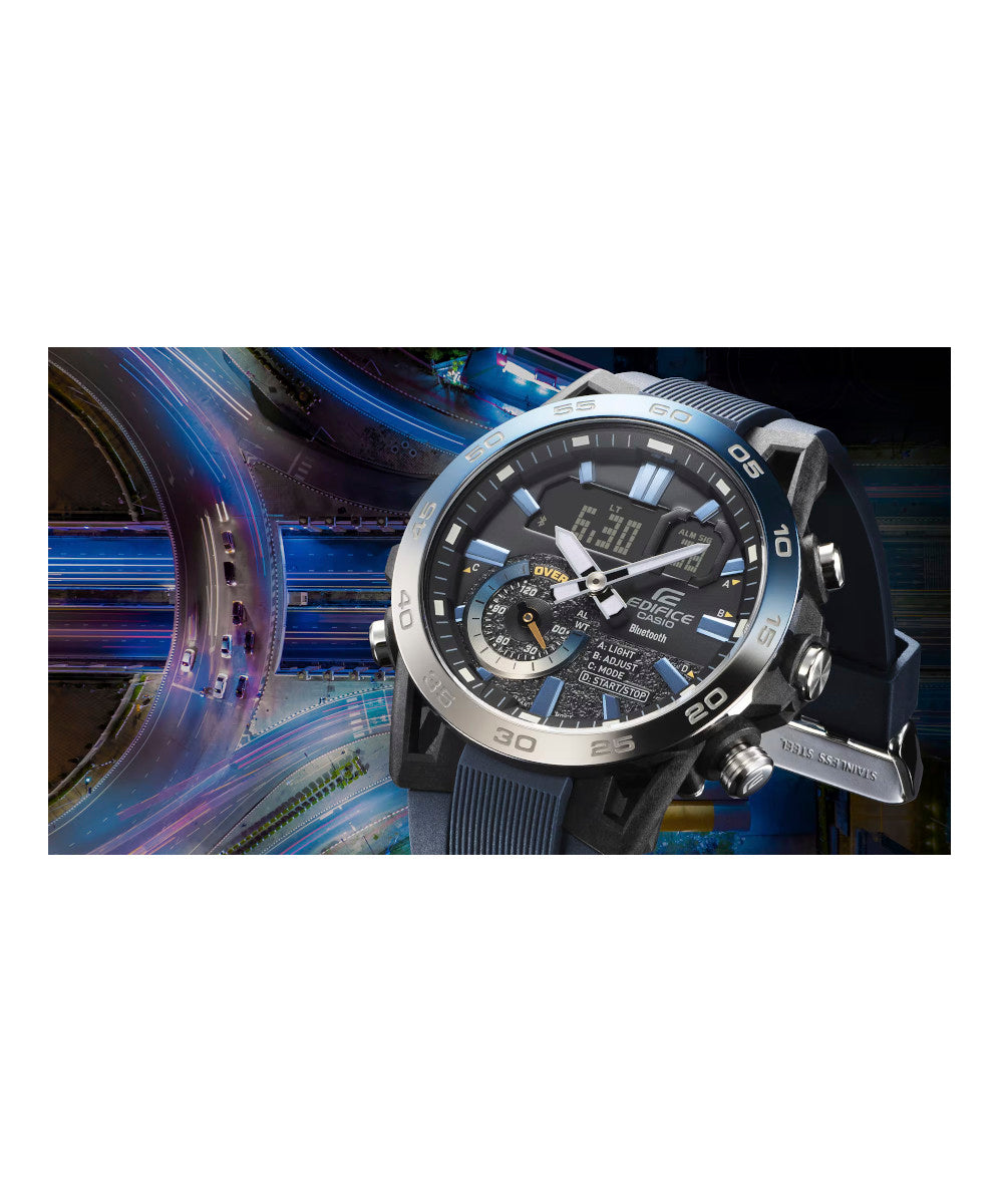 Presentamos la verdadera forma, funcionalidad y sofisticación de los deportes de motor: el EDIFICE SOSPENSIONE ECB-40, con diseño de brazo de suspensión de resina reforzada con fibra de carbono y Smartphone Link. El diseño único de la caja está inspirado en la suspensión de los autos de fórmula con orejetas configuradas en una disposición de cuatro brazos, dos arriba y dos abajo. La resina reforzada con fibra de carbono ofrece una carcasa ligera pero resistente. Gracias a Smartphone Link, este reloj especial se conecta automáticamente cuando está dentro del alcance de un teléfono inteligente emparejado. Toque la aplicación para acceder a funciones que son tan importantes para los equipos de carreras: ajuste automáticamente el cronometraje de precisión al segundo, administre sin esfuerzo el tiempo mundial y transfiera datos del cronómetro medidos al milisegundo para hasta 200 tiempos de vuelta a su teléfono inteligente.