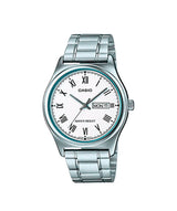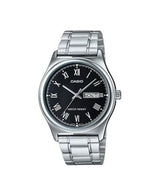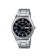 Reloj Casio MTP-V006D-1B2UDF con caja de acero plateado, brazalete metálico y esfera negra con indicador de día y fecha. Movimiento de cuarzo preciso, diseño clásico y versátil para uso diario o formal.