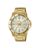 Reloj Casio MTP-VD01G-1CVUDF con caja y correa de acero dorado, diseño analógico deportivo de bisel grueso, resistencia de 50 m y ventana de fecha a las 3 h. Minimalista, robusto y ideal para uso diario.
