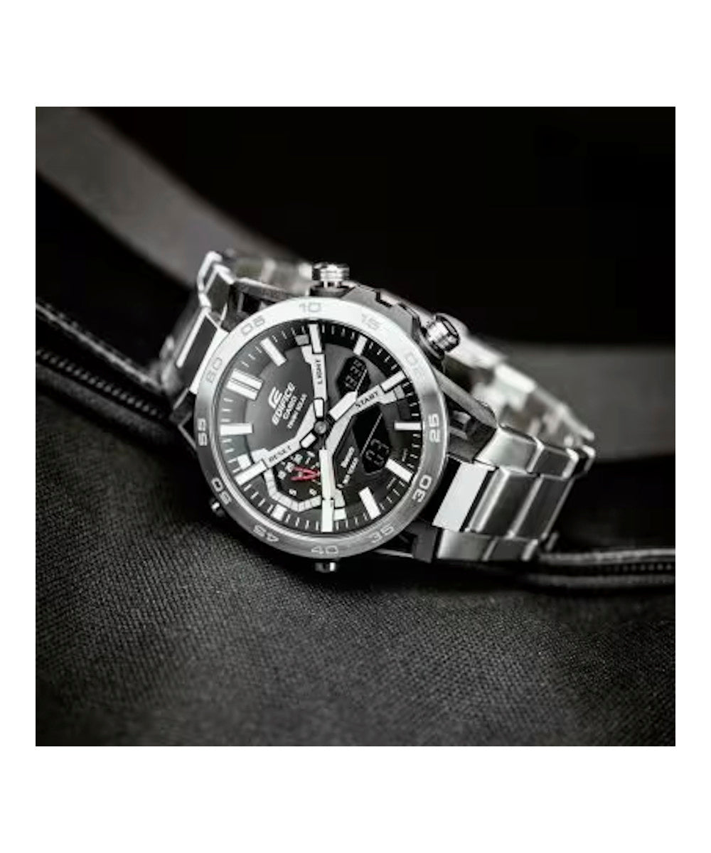 FUNCIONES: Diseño de caja único con un motivo inspirado en la suspensión de los autos de fórmula. Al igual que la suspensión de cuatro brazos que se usa en los autos de carreras, con dos brazos arriba y dos abajo, las orejetas están configuradas en una disposición de cuatro brazos. Por primera vez en la línea EDIFICE, se utiliza resina reforzada con fibra de carbono para la caja. Aprovechando la combinación característica de resistencia y ligereza del material, el reloj ofrece la durabilidad y el ajuste para soportar incluso el uso intensivo por parte de los mecánicos de carreras..