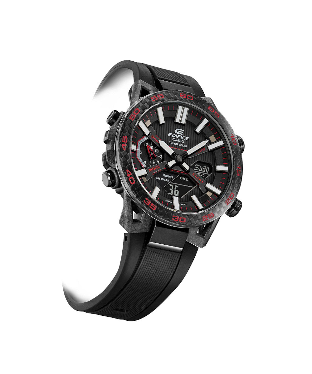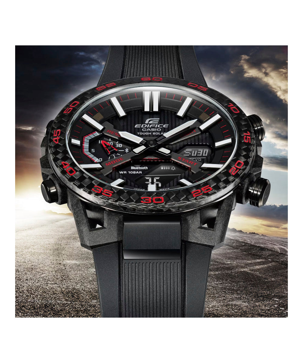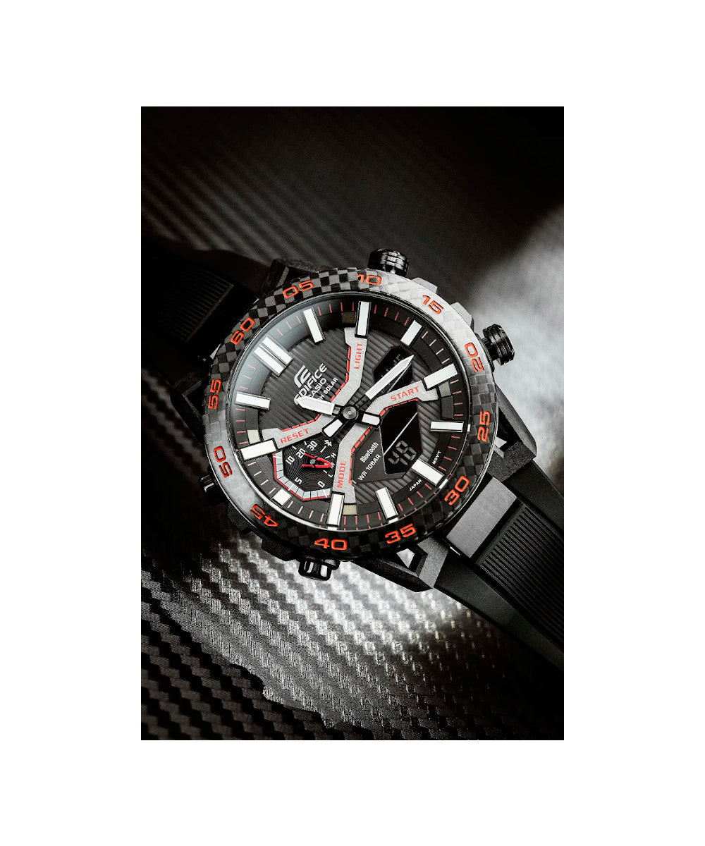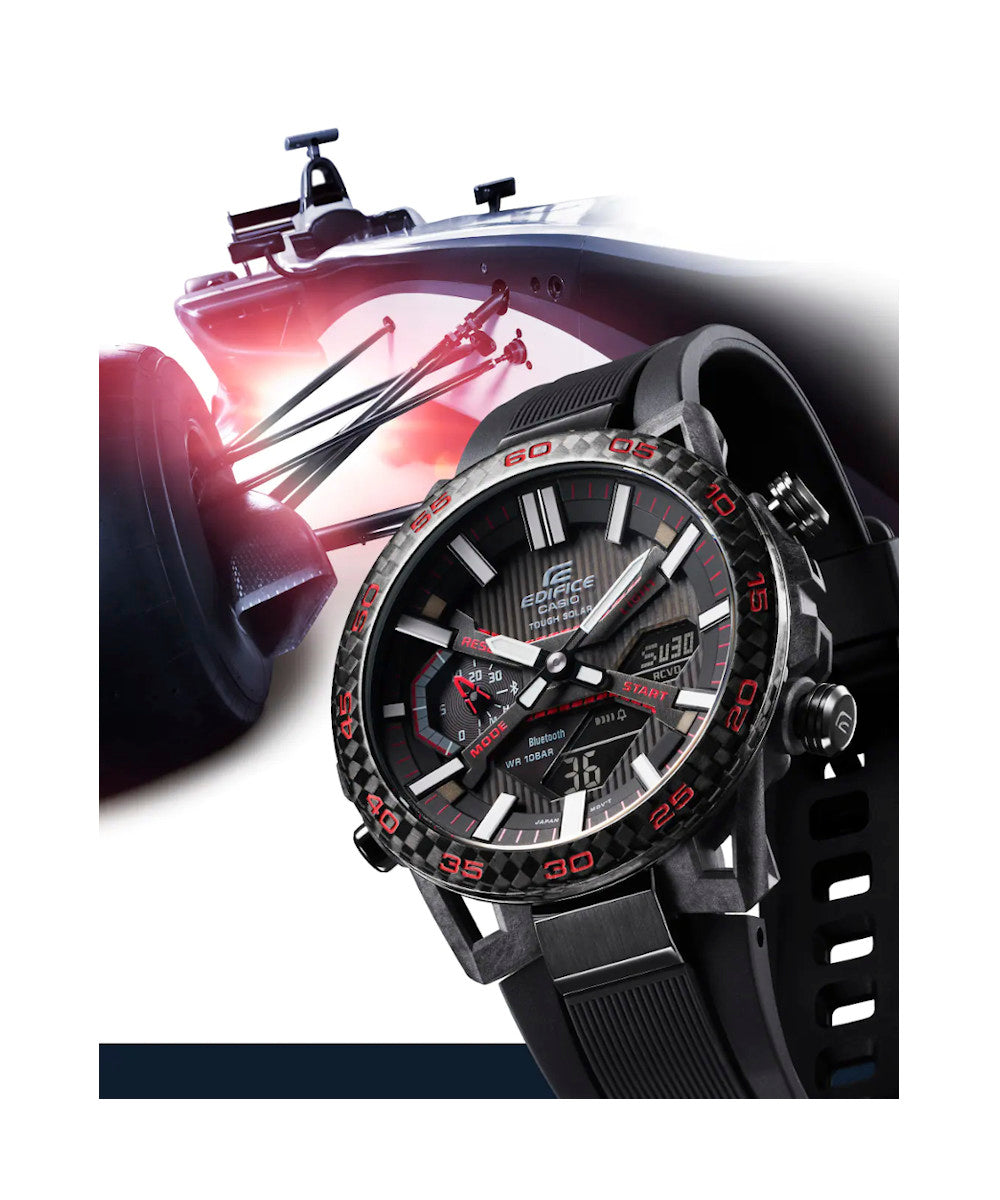 FUNCIONES: Diseño de caja único con un motivo inspirado en la suspensión de los autos de fórmula. Al igual que la suspensión de cuatro brazos que se usa en los autos de carreras, con dos brazos arriba y dos abajo, las orejetas están configuradas en una disposición de cuatro brazos. Por primera vez en la línea EDIFICE, se utiliza resina reforzada con fibra de carbono para la caja. Aprovechando la combinación característica de resistencia y ligereza del material, el reloj ofrece la durabilidad y el ajuste para soportar incluso el uso intensivo por parte de los mecánicos de carreras..