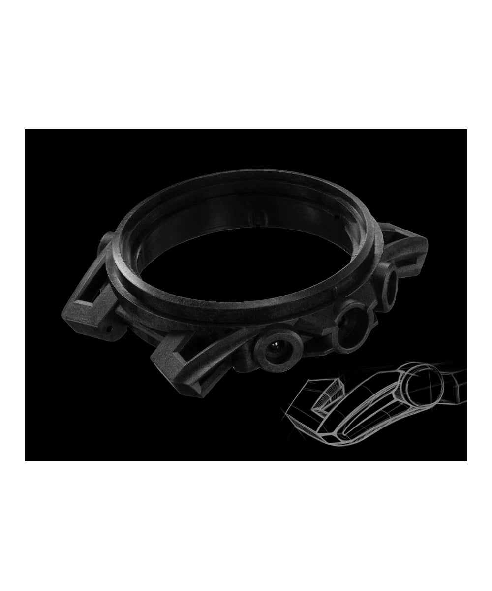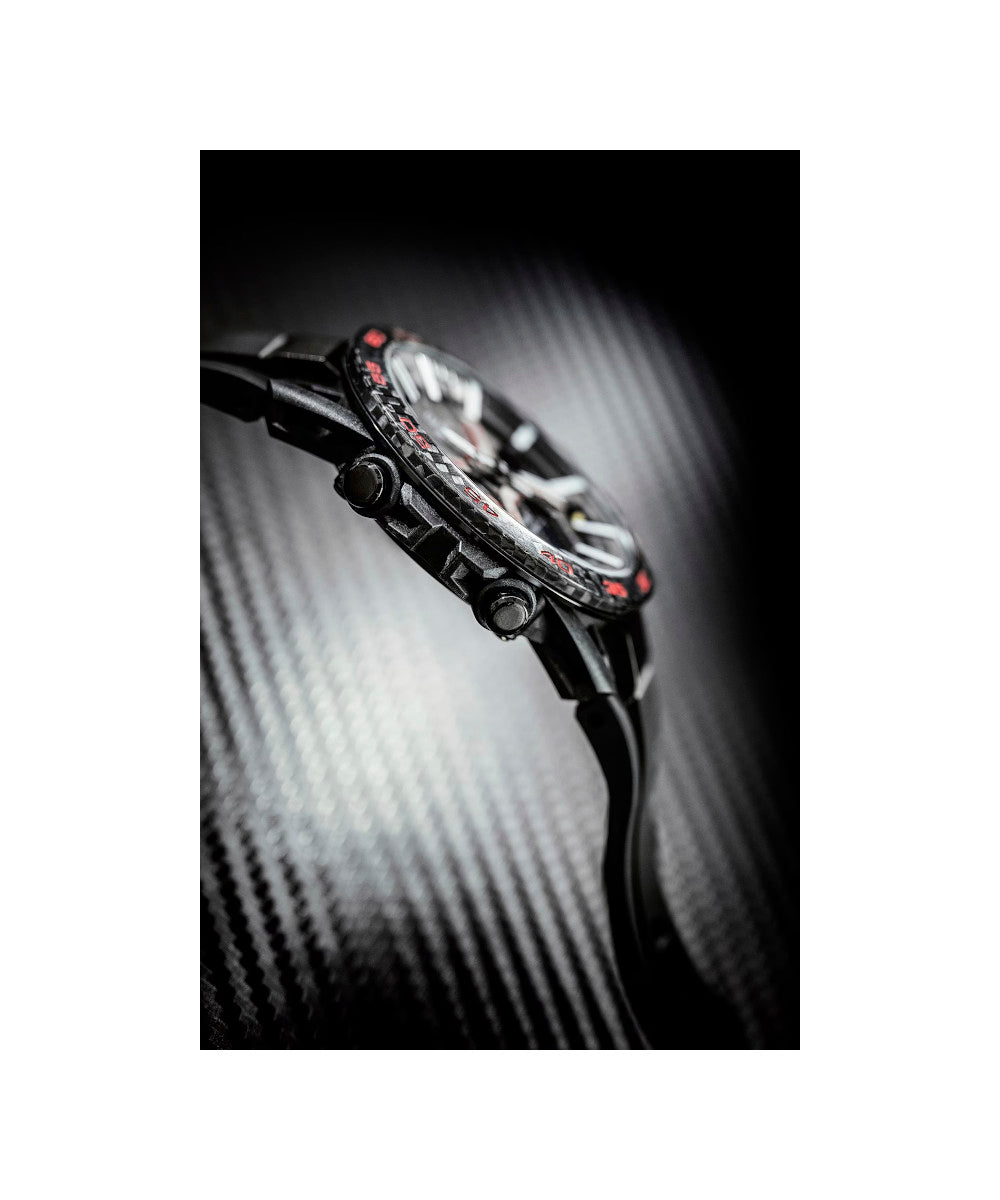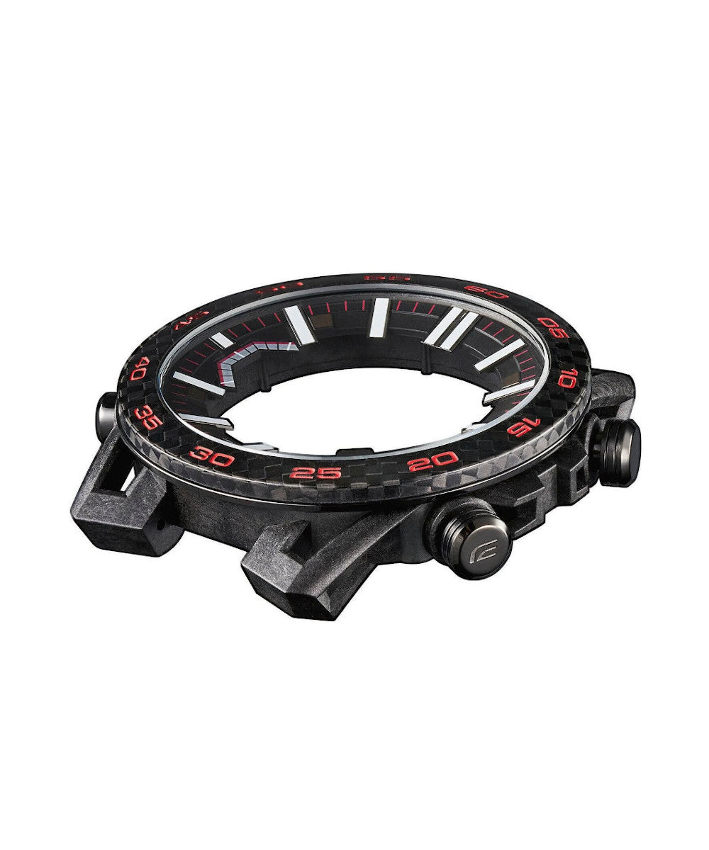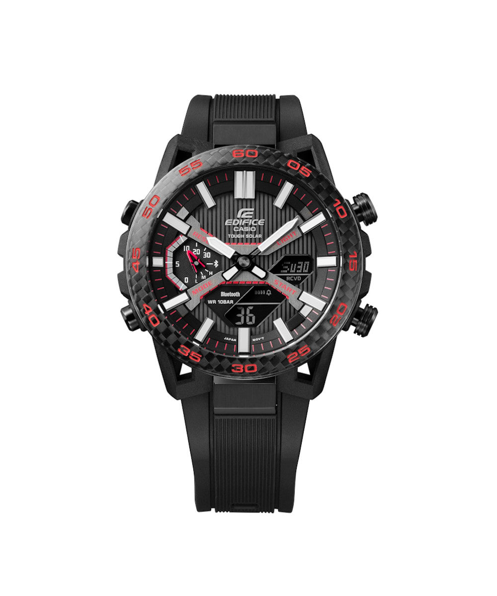 FUNCIONES: Diseño de caja único con un motivo inspirado en la suspensión de los autos de fórmula. Al igual que la suspensión de cuatro brazos que se usa en los autos de carreras, con dos brazos arriba y dos abajo, las orejetas están configuradas en una disposición de cuatro brazos. Por primera vez en la línea EDIFICE, se utiliza resina reforzada con fibra de carbono para la caja. Aprovechando la combinación característica de resistencia y ligereza del material, el reloj ofrece la durabilidad y el ajuste para soportar incluso el uso intensivo por parte de los mecánicos de carreras..