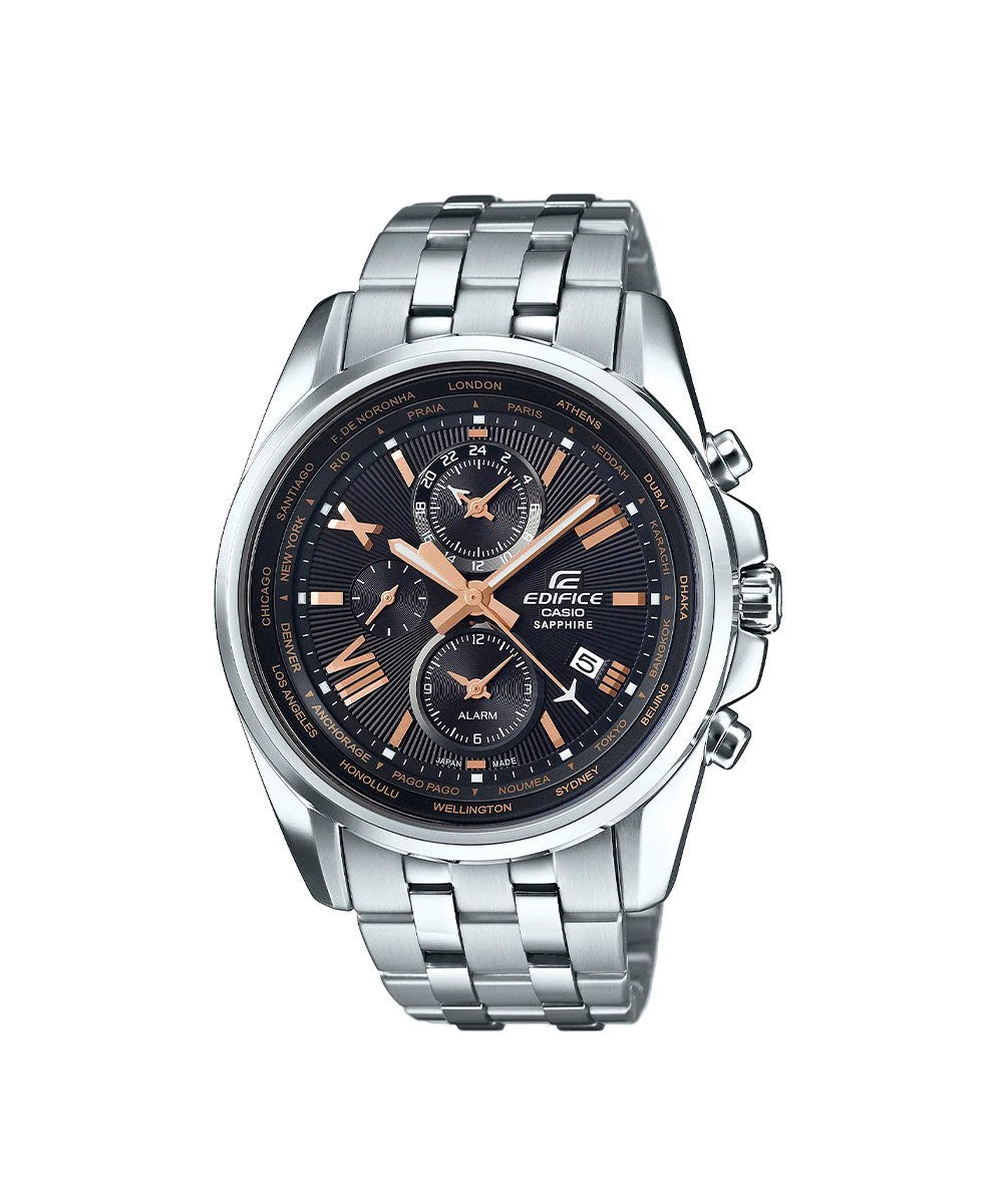 FUNCIONES: Reloj EDIFICE, en acero inoxidable sólido, cristal zafiro, alarma, visualización de la fecha, hora mundial, resistente al agua 100 metros, cronógrafo.