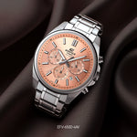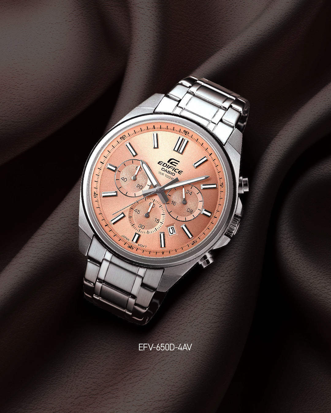 El Casio Edifice EFV-650D-4AVUDF combina robustez y elegancia. Con caja y correa de acero, esfera rosada, cronógrafo y resistencia al agua 100 m, es un reloj moderno y sofisticado para quienes buscan estilo y precisión.