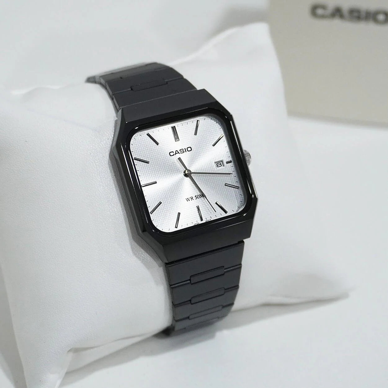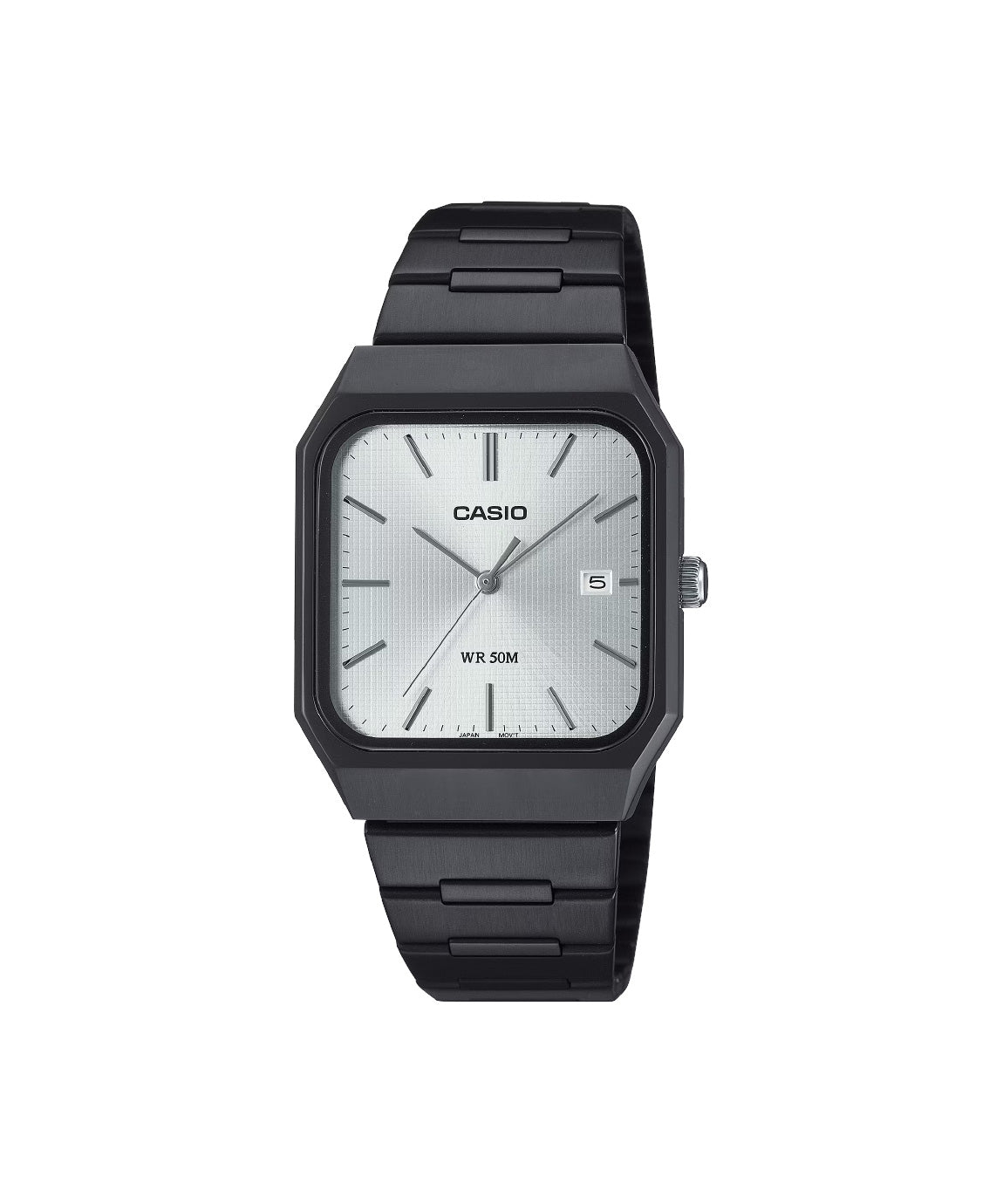 Casio MTP-B185B-7AVDF para hombre con esfera blanca y correa negra en acero ionizado. Diseño moderno y elegante, resistente al agua 50 m, con cristal mineral y movimiento de cuarzo. Estilo sofisticado y versátil.