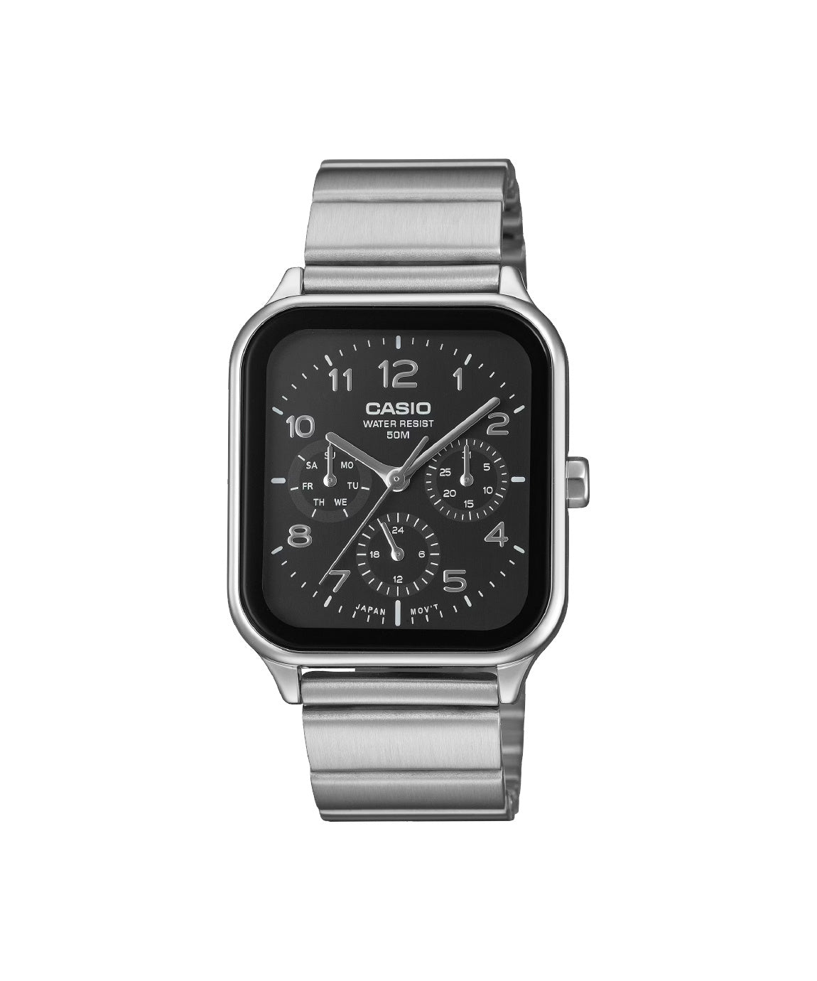Casio MTP-M306D-1AVDF para hombre con esfera negra y subesferas multifunción. Caja y correa de acero, resistente al agua 50 m. Diseño elegante y robusto con calendario y movimiento de cuarzo preciso.