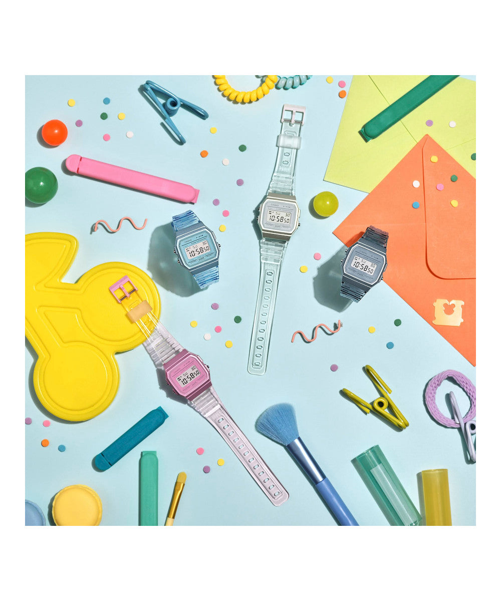 FUNCIONES: Reloj digital, resistente al lavado de manos y salpicaduras, luz de fondo LED, cronómetro - 1/100 seg. - 24 horas, segunda zona horaria, calendario automático, indicación de hora normal de 12/24 horas, 5 alarmas múltiple, señal horaria, función de despertador.